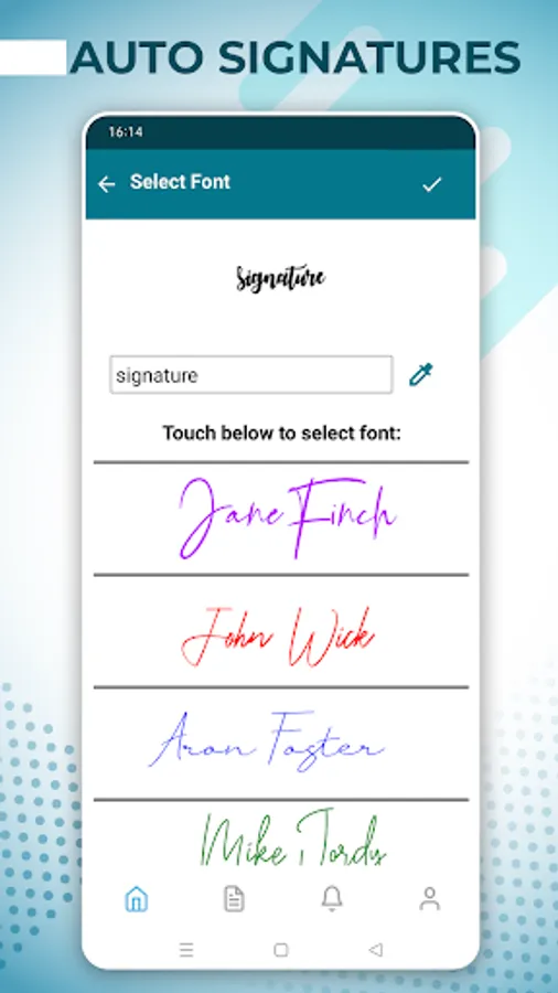 Select auto signature option from the home screen. Create and design signature with signature maker option. In signature maker : docu sign you will get a large number of fonts and designs. You can use presets on document sign maker.