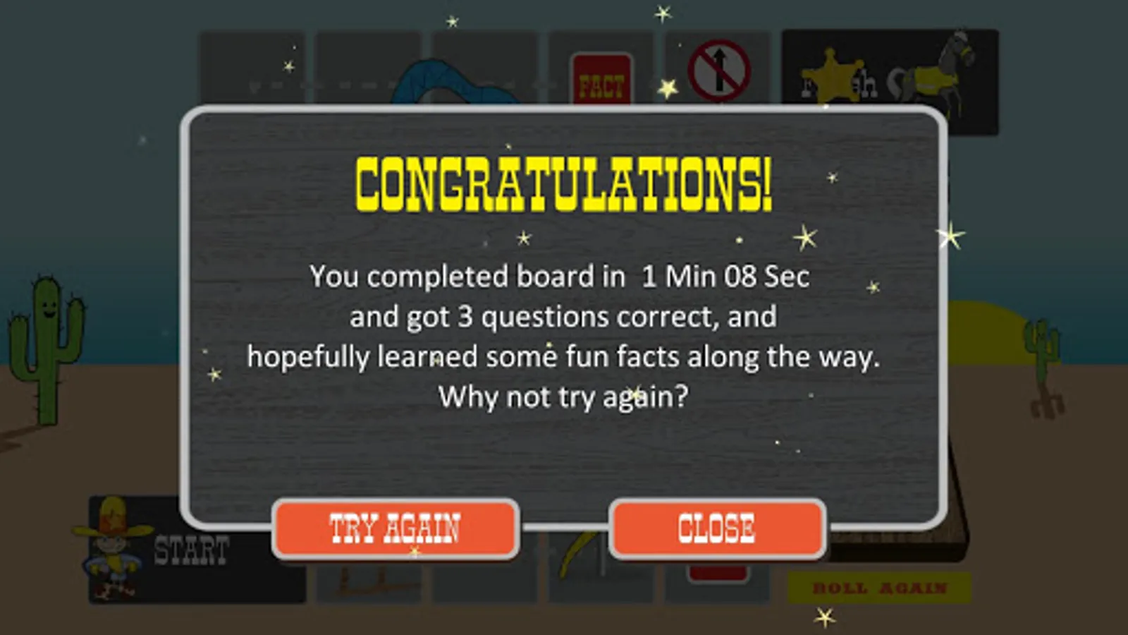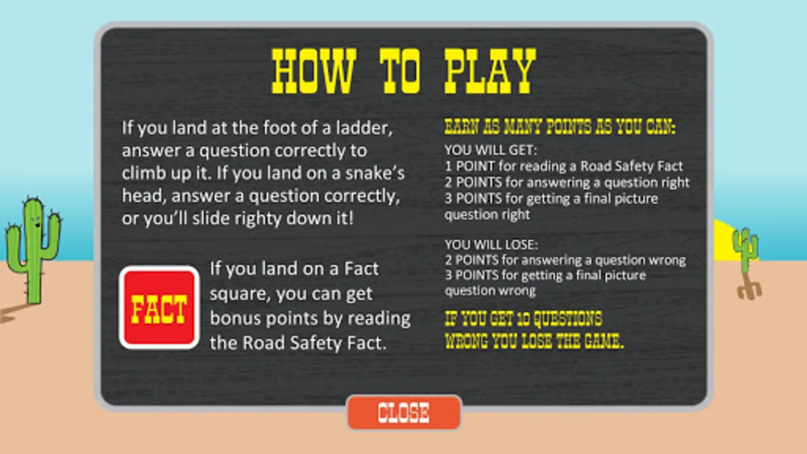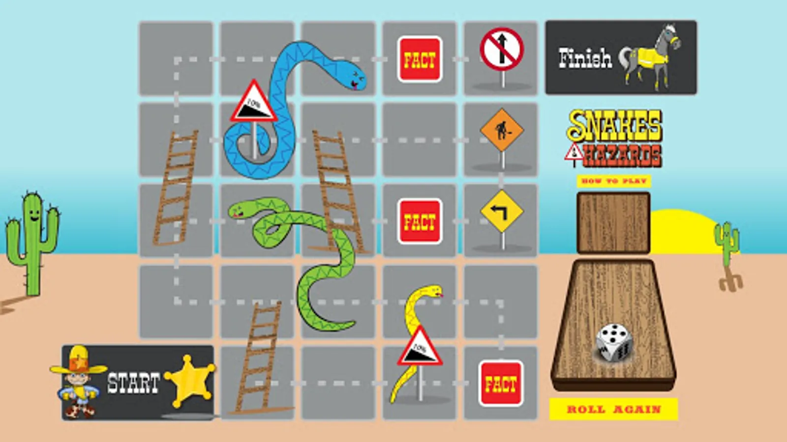A fun game with a serious message - progress along the board with every roll of the dice, answering Road Safety questions to climb the ladders and avoid sliding the snakes, while also learning Road Safety Facts and what various Road Signs means! Are you ready to travel?
