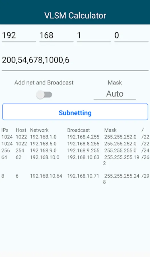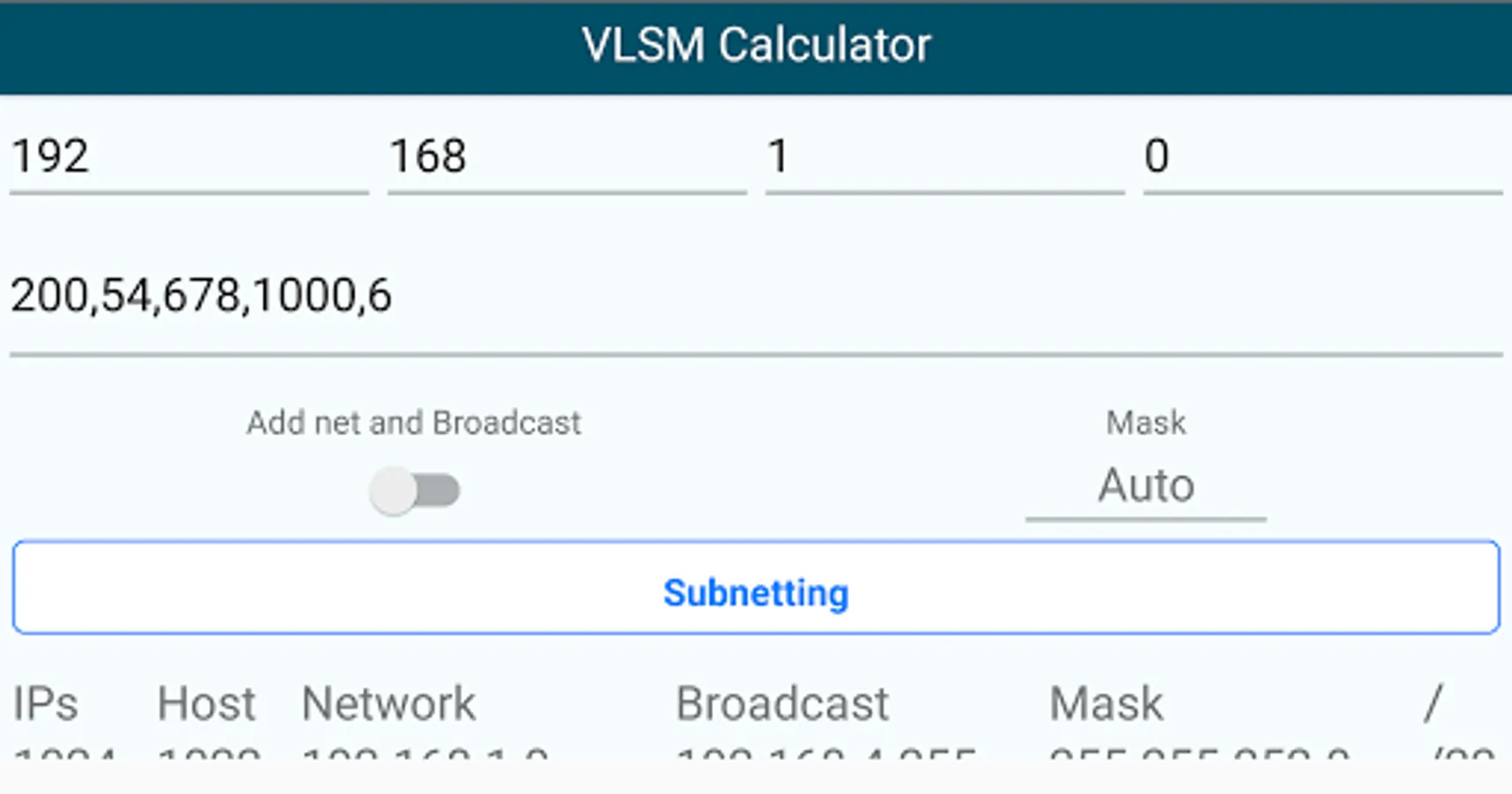 This application will help you to perform subnetting using Variable Length Subnet Mask (VLSM).