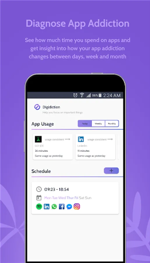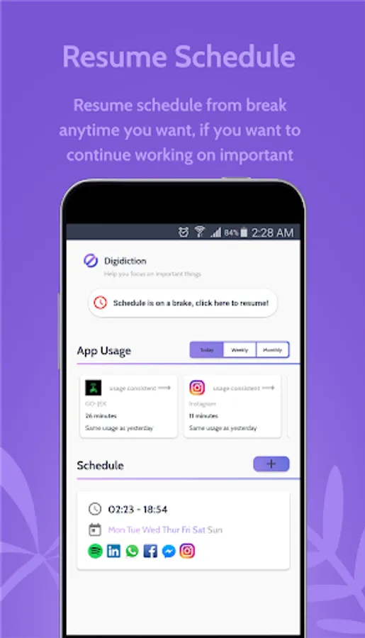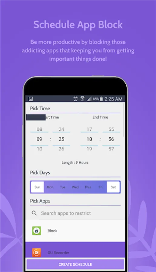 Create schedule that let you specify days, time and apps you want to spend less time on. Apps keep distracting 🤳 you from Work ? then create schedule 📅 for work days from 08:00 AM to 04:00 PM and tag those distracting app, blocked apps cannot be opened on scheduled time.