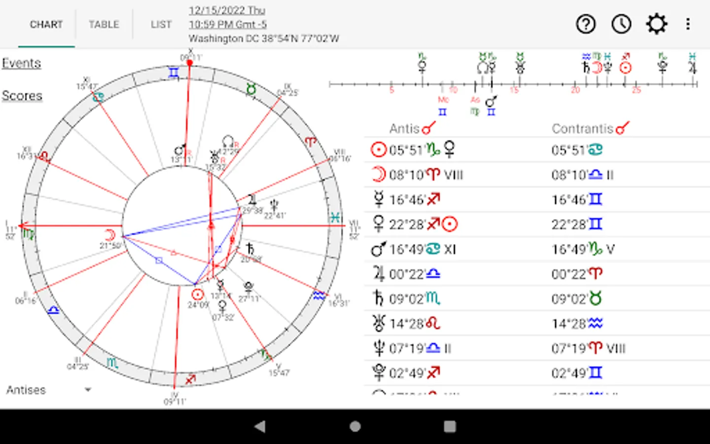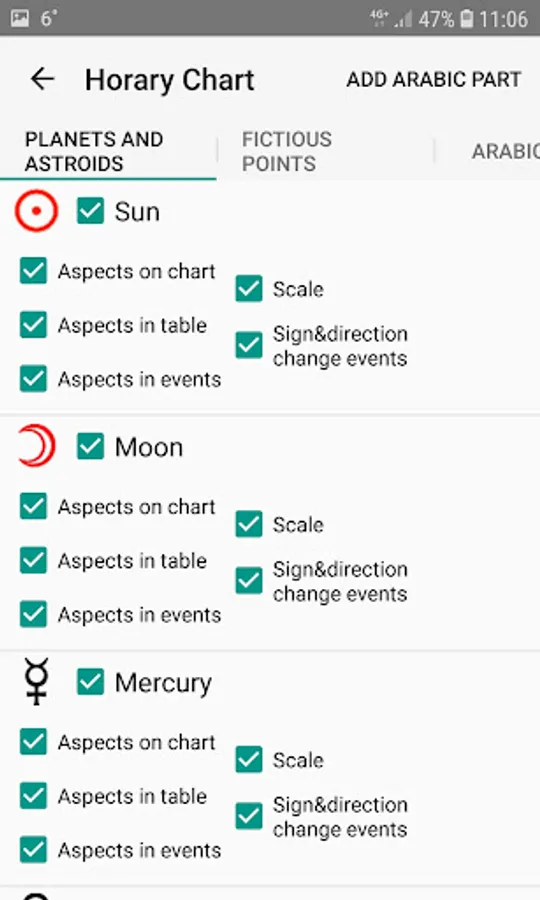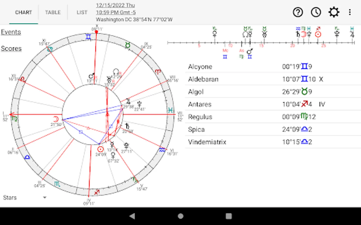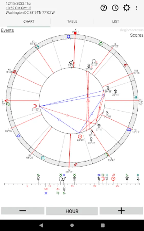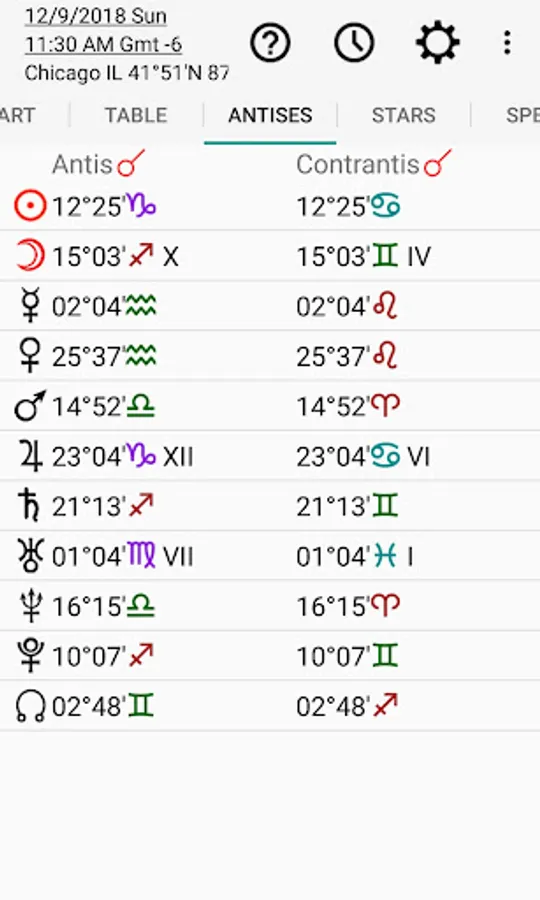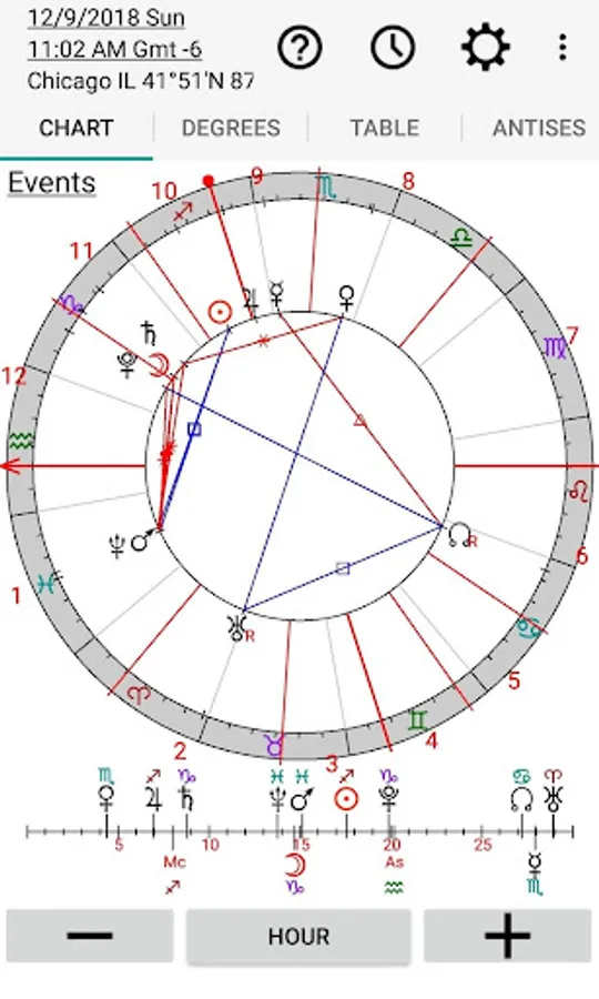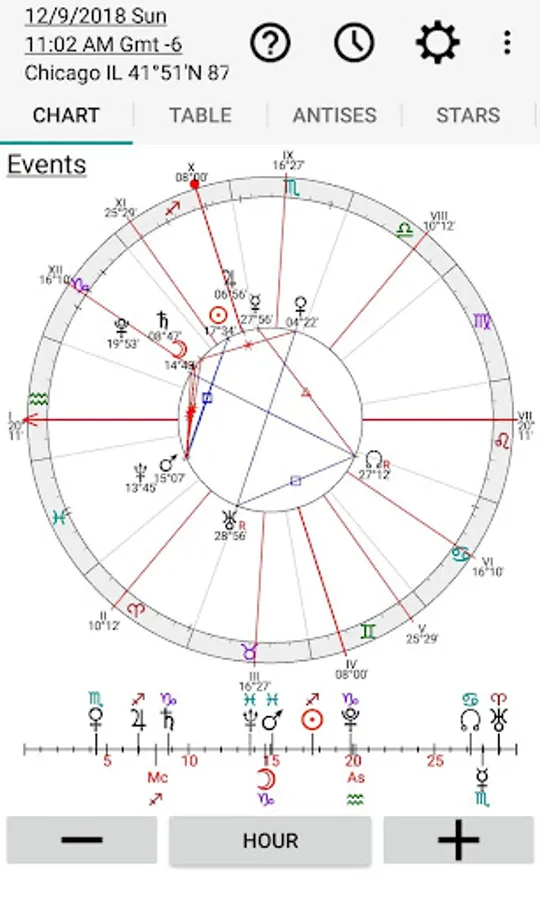Horary chart is a program for building horary charts, including an astrological chart with a degree scale, the calculation of events within zodiac sign and showing the conjunctions of planets and houses with antis and stars. There is a function to add formulas of lots (arabic parts) and a choice of one hundred stars.