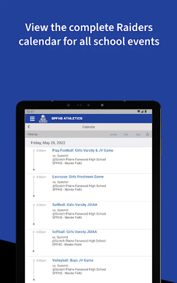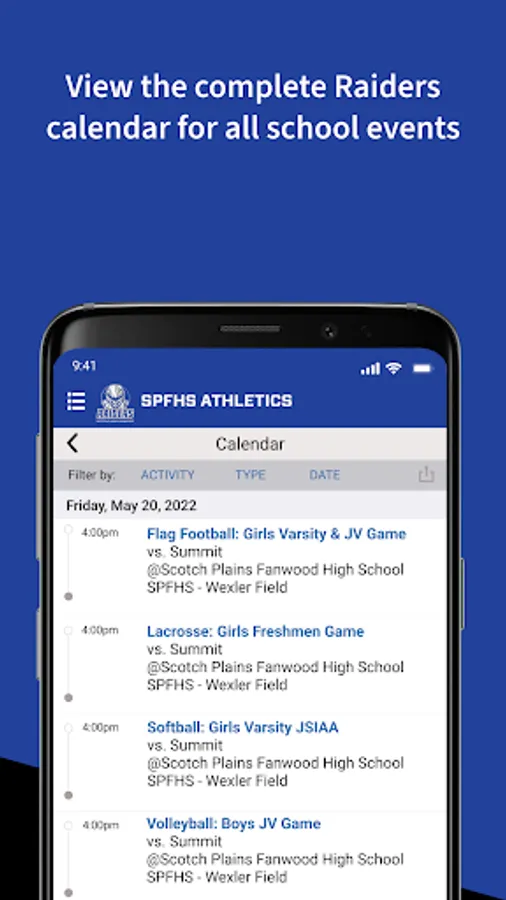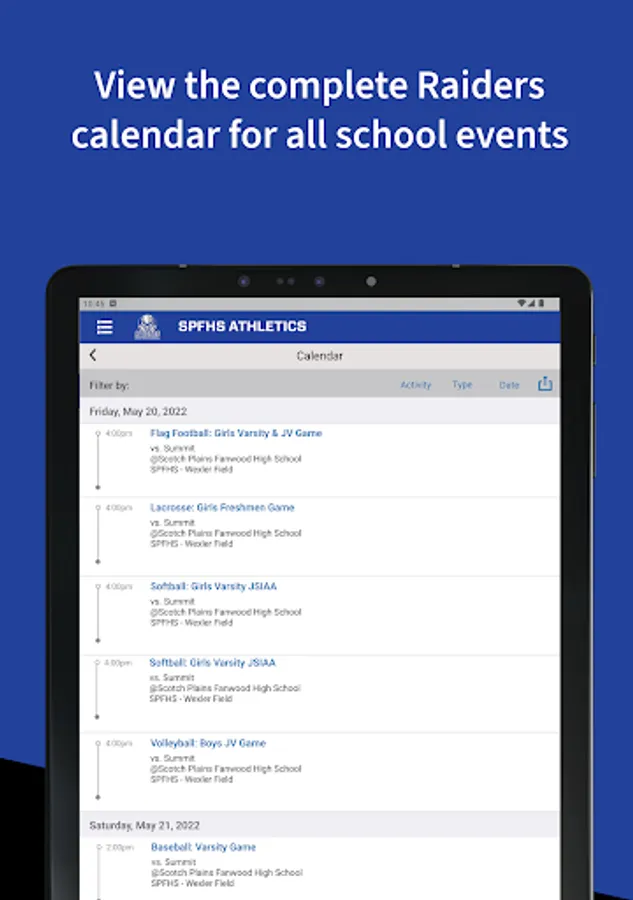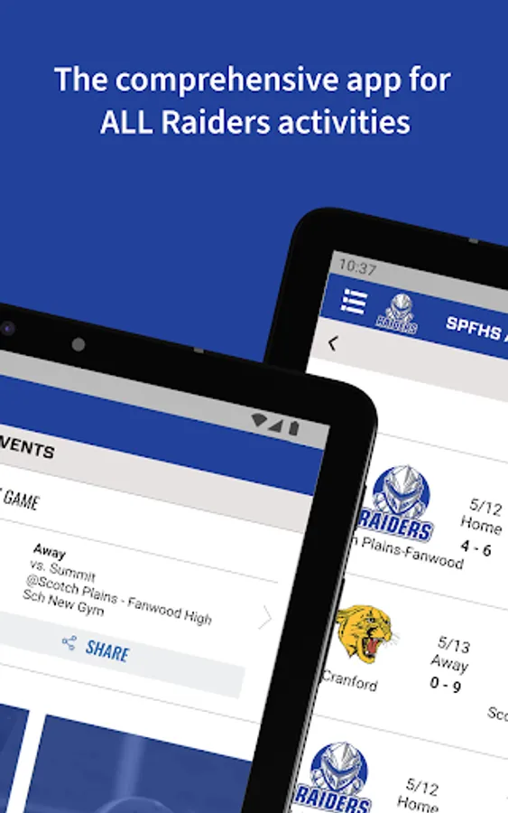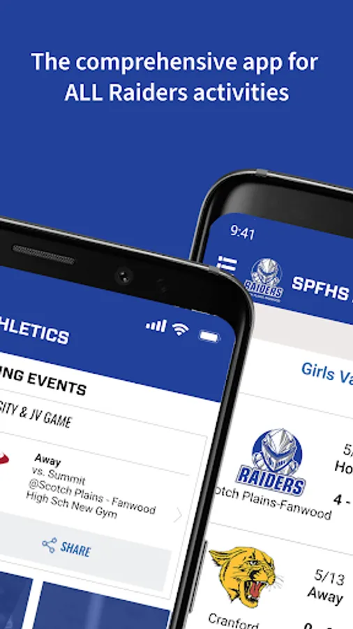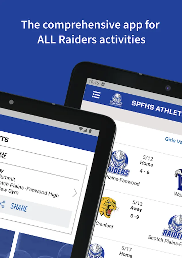The Scotch Plains-Fanwood Athletics App is your source for game schedules and locations. Rosters, teams, scores, and other valuable information is available through this app.