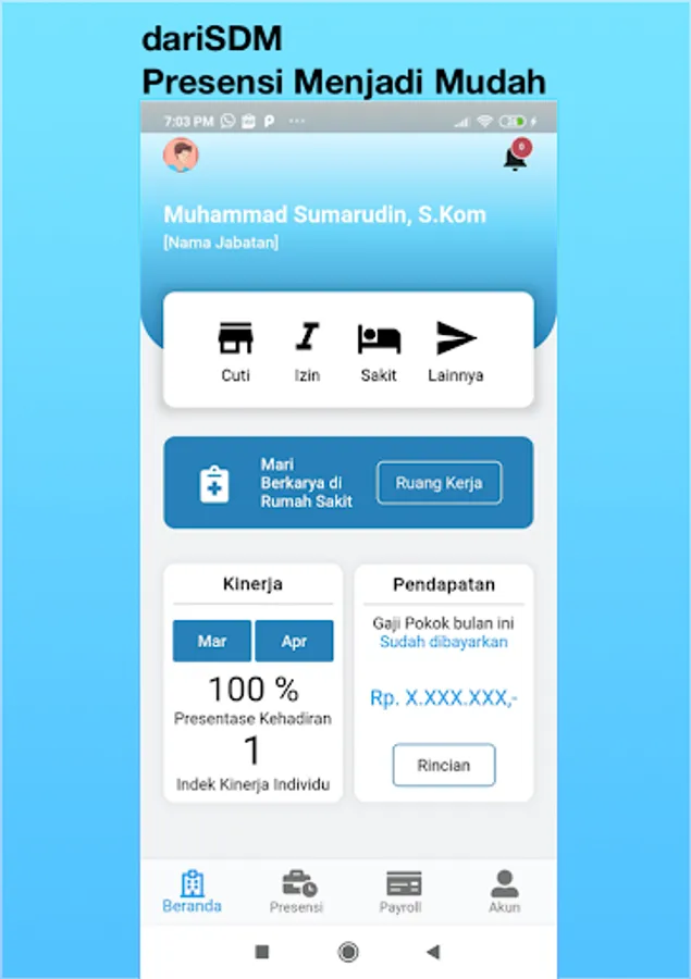 dariSDM is a Mobile Application for RSUPN dr. Cipto Mangunkusumo makes it easier for employees to make attendance, list of patients visiting DPJP, employee performance, payroll and viewing correspondence.
