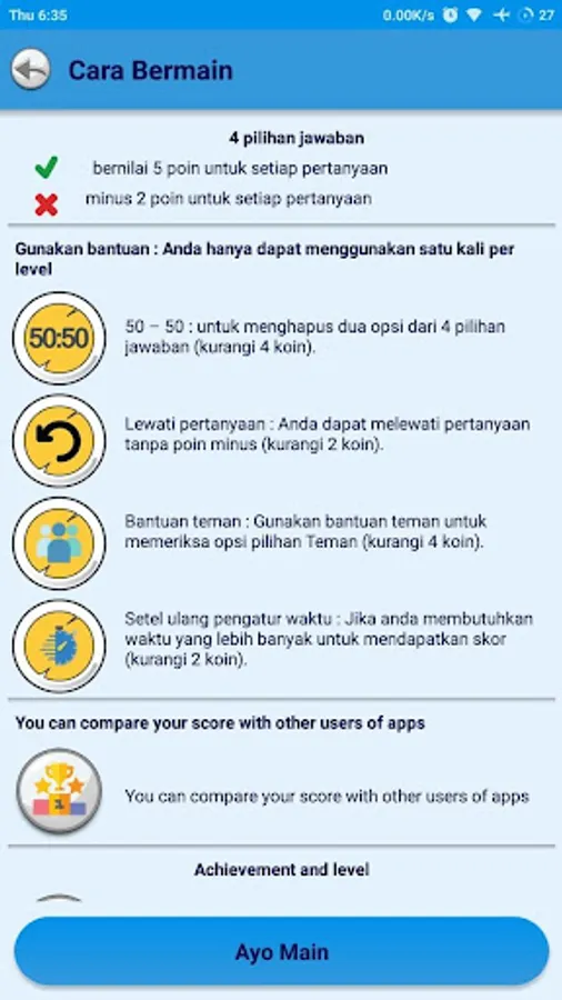- 50:50 help, to remove two options from 4 answer choices (subtract 4 coins)