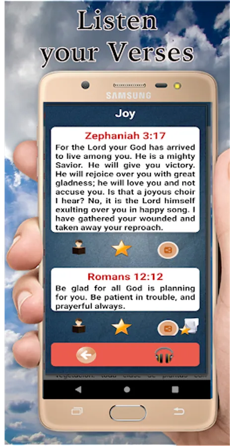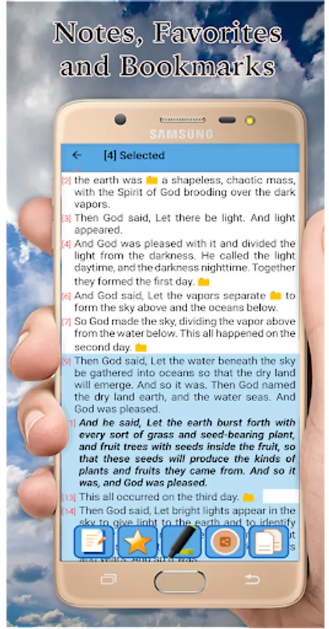 You can select one or several verses of a chapter and mark as a favorite you can also share with your friends the verses in the different social networks. By clicking on the favorite clip, you will see the verses that you marked for quick access.