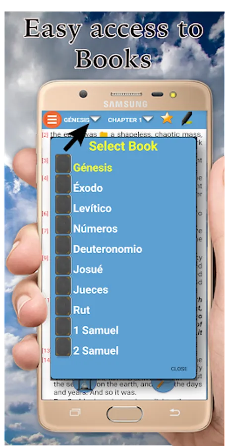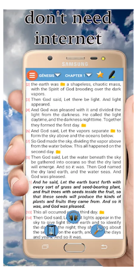 The audio playback performed by the application is using the Voice Synthesizer that contains the cellular device or tablet. If the device does not support this functionality, the program will indicate it. Access to the options menu quickly and sensibly. Option to change the text size. Change of reading background of the book. Access to favorite chapters and verses. Search for words in books, chapters and verses. Night mode to facilitate reading and decrease the light of the screen. Notification Daily a verse. You can click on the screen and the lower part will show the name of the book and the chapter, when pressed, the list of books will appear and in the other the chapters that the selected book has.
