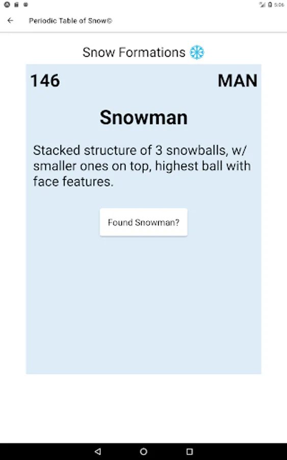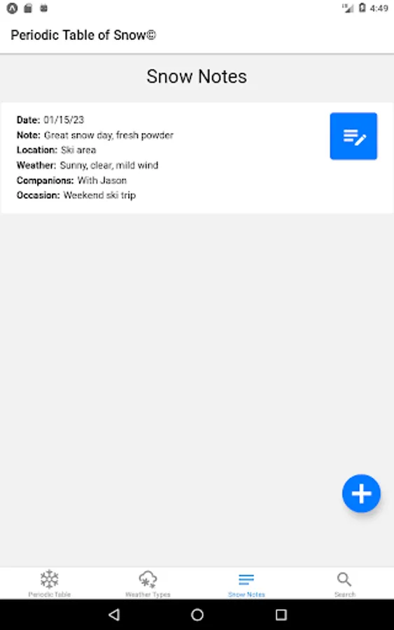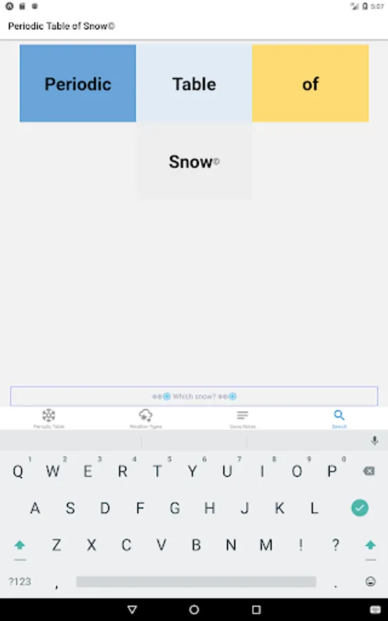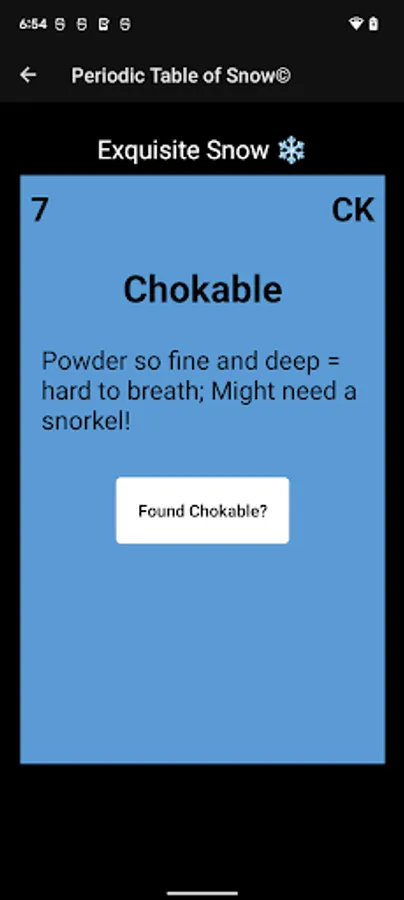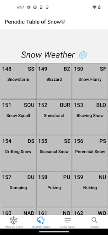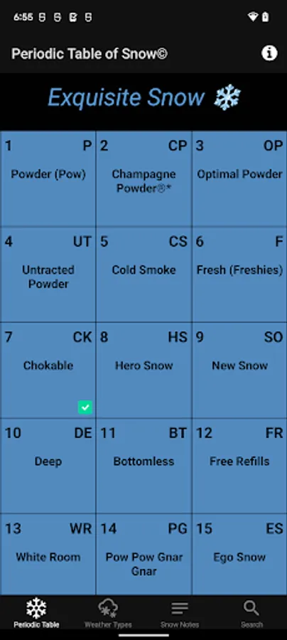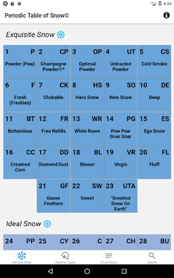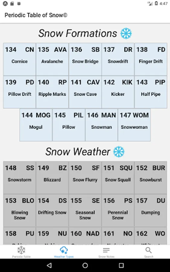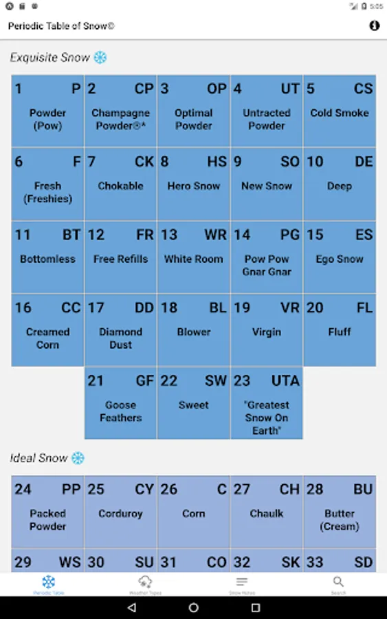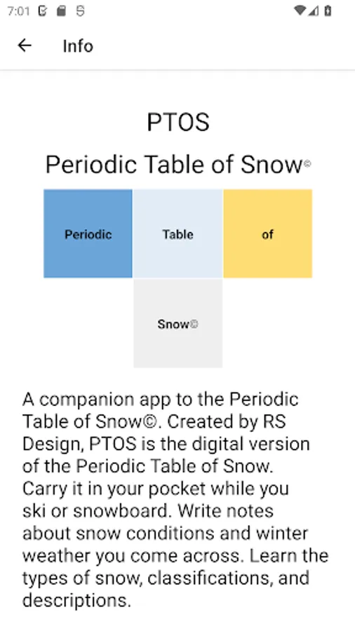 It's like having an encyclopedia of snow conditions in your pocket! A companion app to the Periodic Table of Snow©. Created by RS Design, Table of Snow is the digital app version of the Periodic Table of Snow. Carry it in your pocket while you ski, snowboard, snowshoe or any outdoor winter activity. Keep track of snow conditions, winter weather, and more with the snow notes feature. Find and mark the proper name of snow conditions that you encounter in the wild. Learn the types of snow, scientific classifications, and descriptions. And don't forget the snow humor! It's all packed into the Table of Snow app.
