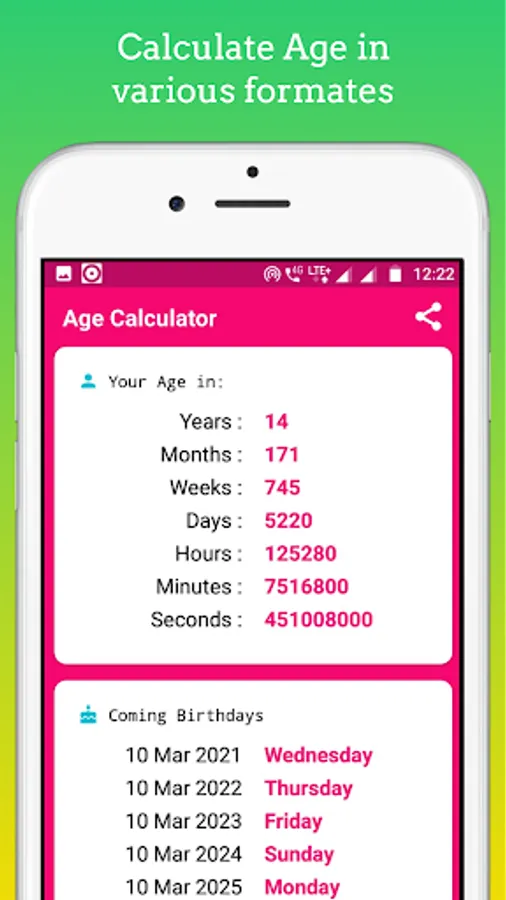 This App also displays the remaining number of months and days in your next Birthday. You may find it amazing to know the weekdays of your coming 10 Birthdays.