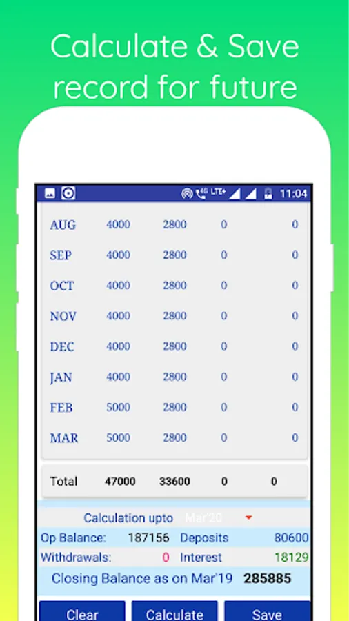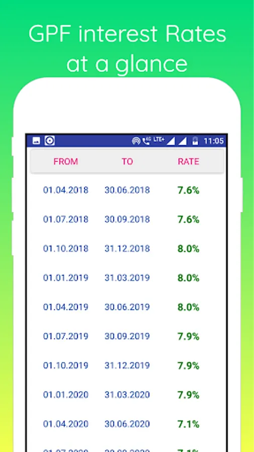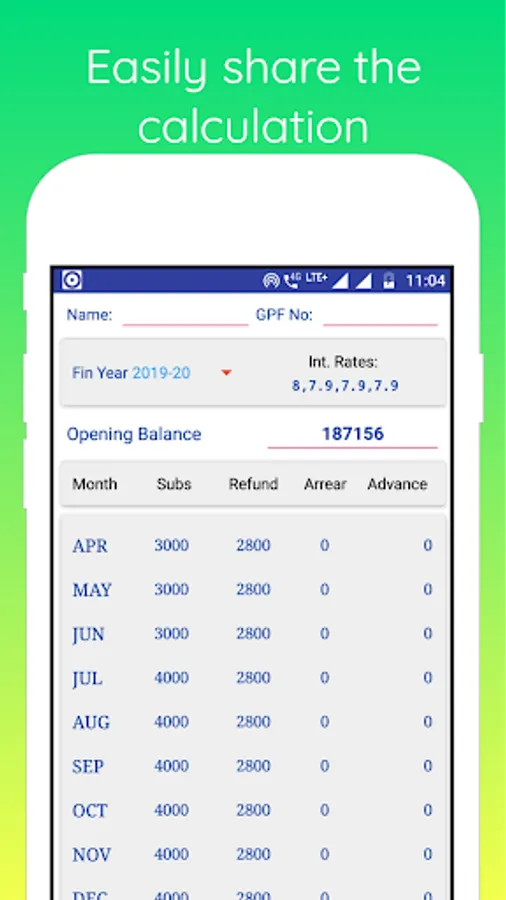 GPF Calculator is an easy to use android application that helps to calculate fund balance accurately. No need to input rate of interest for GPF because it can fetch interest rates from the system as soon as you select the Financial Year for calculation. It can also automatically feed data for the following month regarding GPF contribution, refund etc after making your first entry. You can calculate GPF balance with or without saving it. Saved calculation record can be fetched as and when necessary. The record can also be saved in your device in PDF format like a calculation sheet but that requires your permission. This app can calculate interest as well as fund balance up to any given month of a year. You just need to select that particular month from the drop-down menu of calculation up to. Also find the list of interest rates for the previous years by clicking just one button.