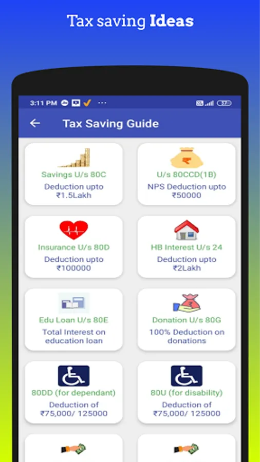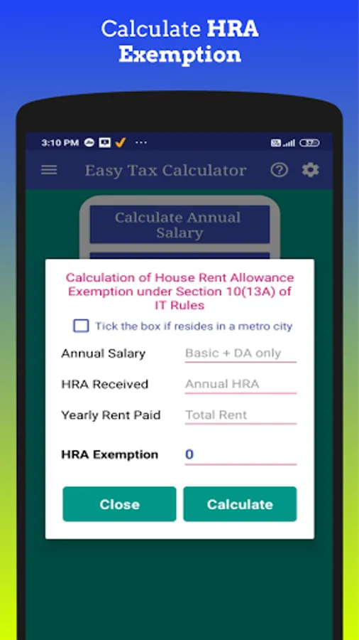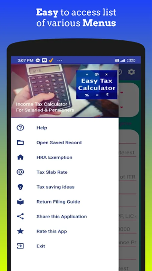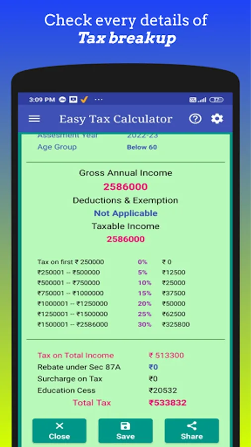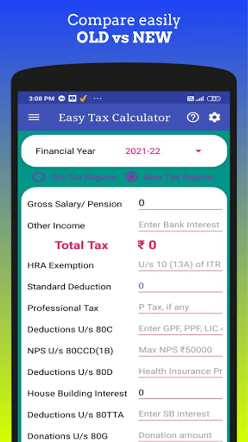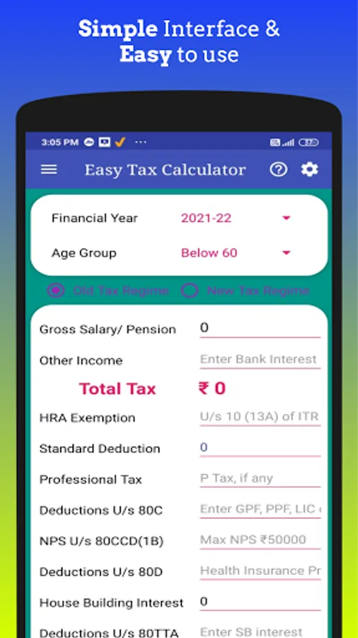 Income Tax Calculator is a utility app that helps you calculate the tax for your income in no time based on the latest Indian tax rates. This app is a useful tool for Indian individuals, especially Salaried employees and Pensioners. In this app, you can calculate tax for the Financial years 2018-19, 2019-20, 2020-21, 2021-22, 2022-23 and the Financial Year 2023 - 24 (AY 2024-25).
