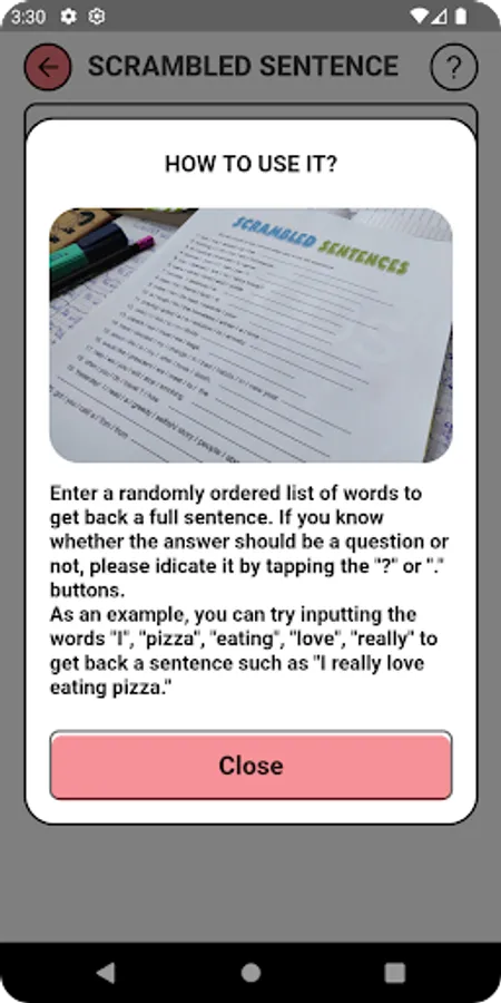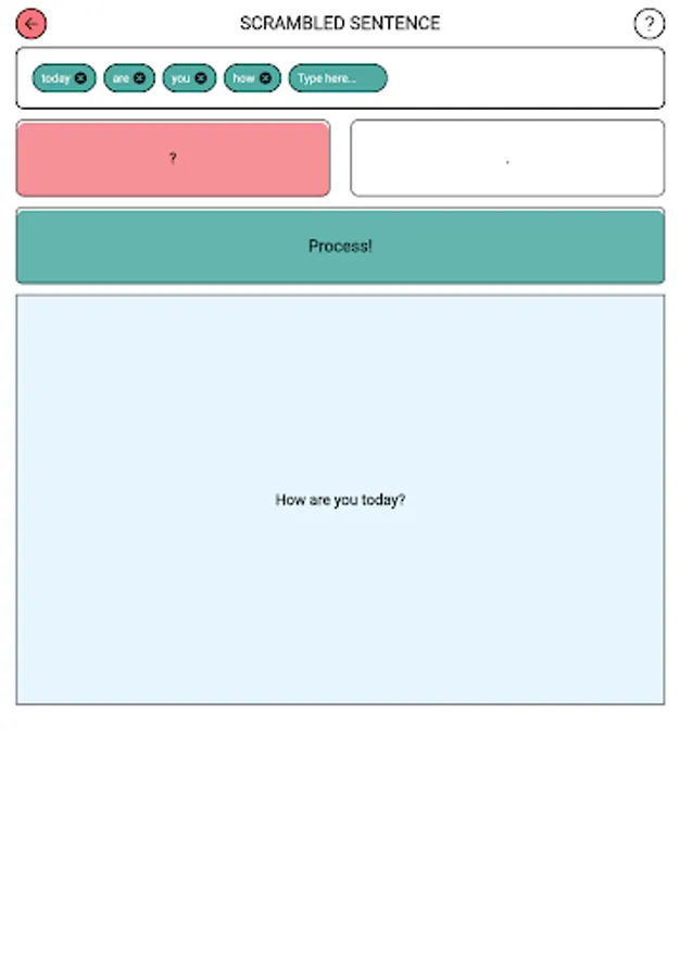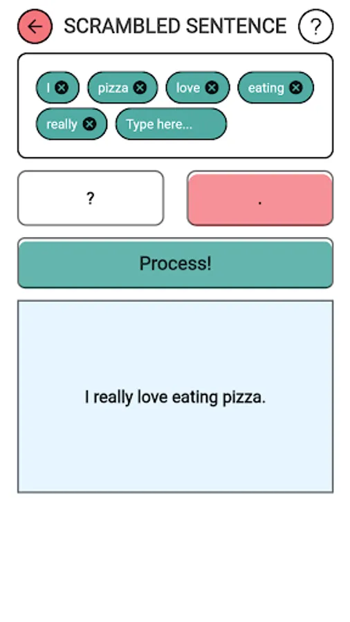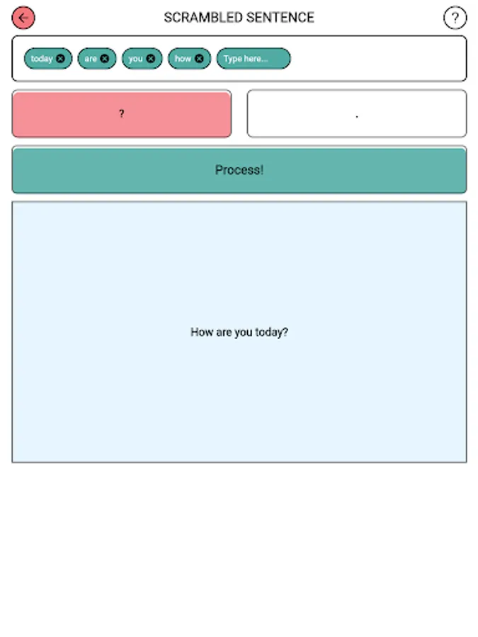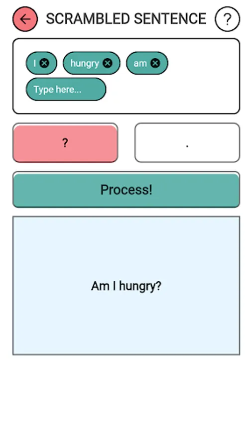 - Give the app a list of scrambled words and get back a complete sentence. You can also indicate if you know whether the sentence should be a question or not.