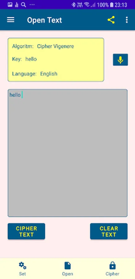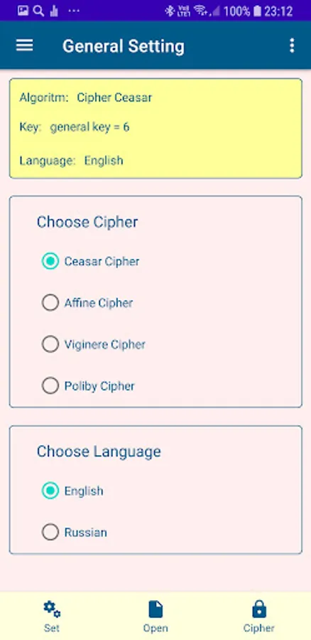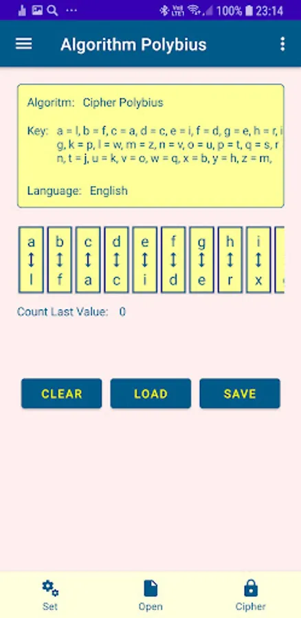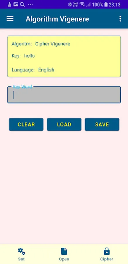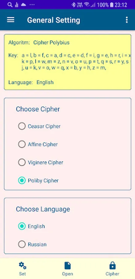 The application allows you to use four historical ciphers and study them