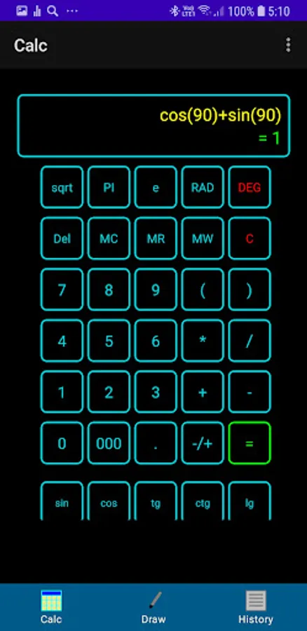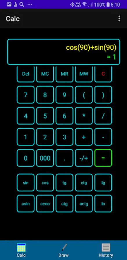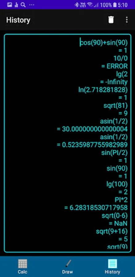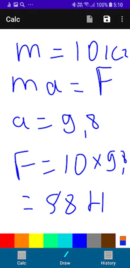The calculator contains the history of calculations, and also contains a screen for writing a problem with a pen on the screen of a tablet or phone
