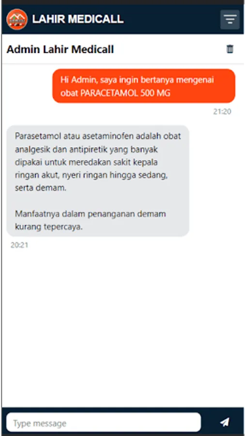 Aplikasi Lahir Medicall adalah salah satu produk Rumah Sakit dr. hasri Ainun habibie Parepare yang membantu pasien dalam berkonsultasi mengenai obat yang diberikan.