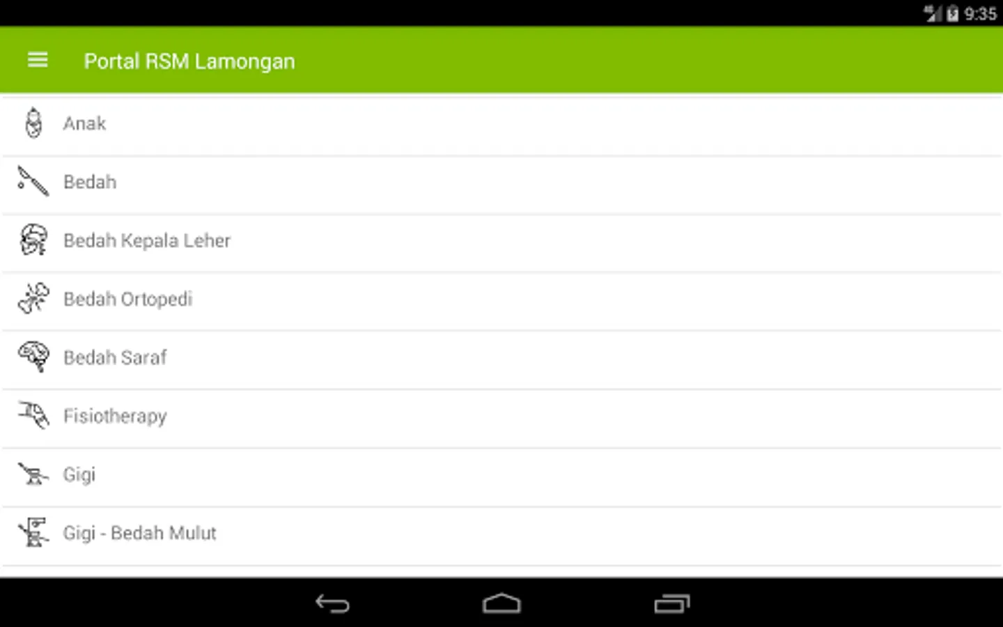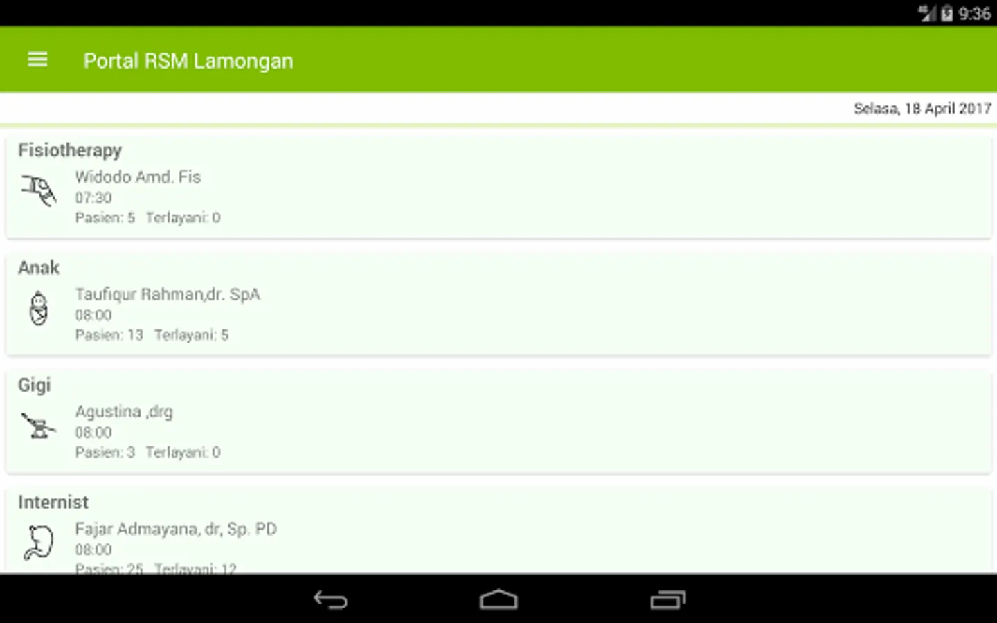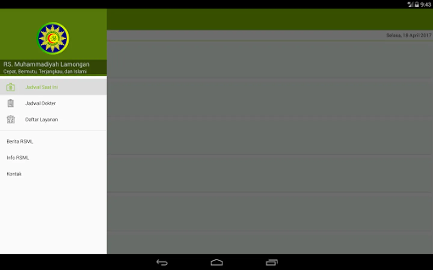This android application is connected directly to the doctor's schedule, online registration, info and the latest news about Muhammadiyah Hospital Lamongan, in the future this application will always be updated with more complete features, including room availability, and others.