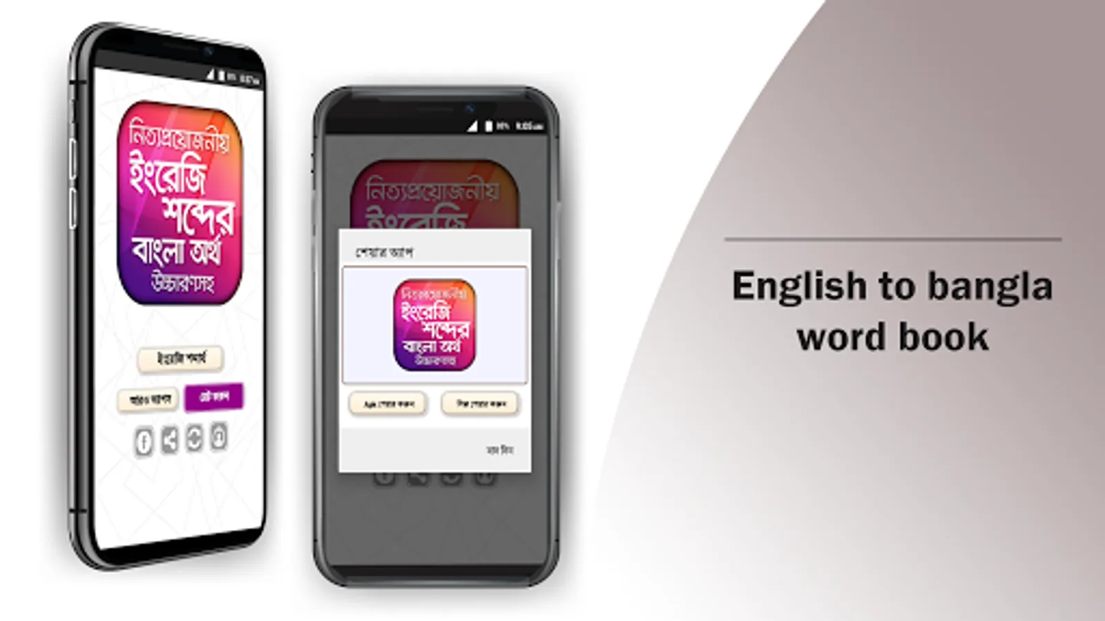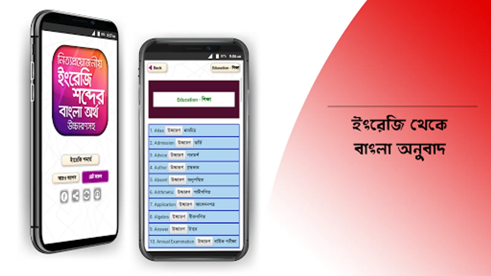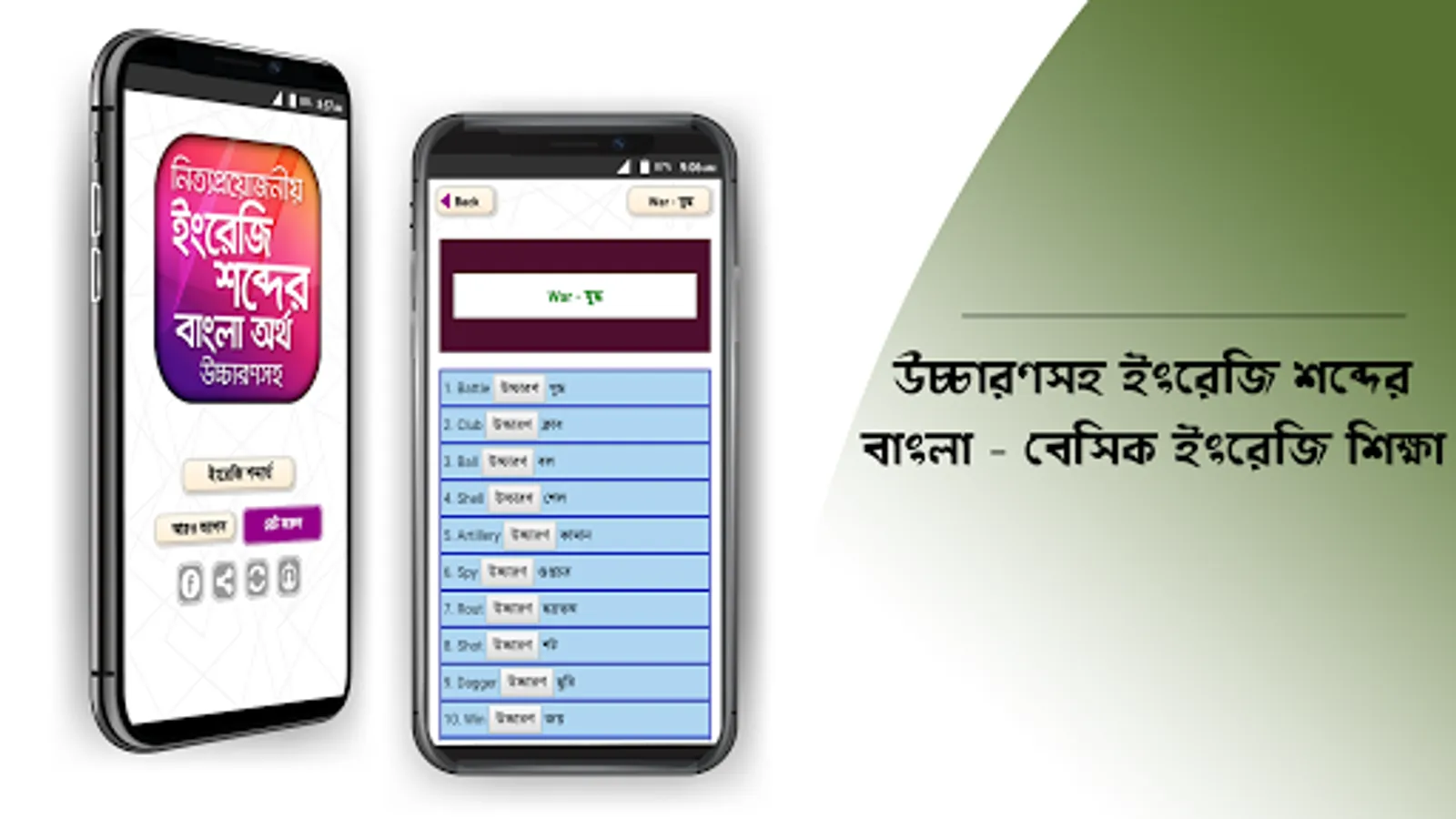 ইংরেজি শব্দের বাংলা অর্থ উচ্চারণসহ ডিকশনারি। vocabulary english to bengali. ইংরেজী জানার জন্য Vocabulary English to Bangla জানাটা খুবিই দরকার। সেদিক চিন্তা করে আমাদের ইংরেজি শিখুন সহজ পদ্ধতিতে অ্যাপটি দেয়া হলো। আমাদের অনেক সময় English to Bangla Dictionary বা E2B Dictionary প্রয়োজন হয়। এই অ্যাপসটি আপনি Wordbook বা Dictionary হিসেবে ব্যবহার করতে পারেন।