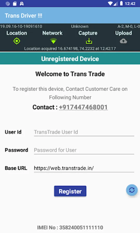 Phone associated with Truck is called as Truck Device. Truck Device registration is done by sending a SMS containing username, password to Truck Device through TransTrade portal. Driver then Confirms auto filled information in Registration form and registers Truck Device with TransTrade portal. Hence onward trucks location and its current state such as Online, offline, in-transit is tracked by TransTrade portal with help of this app.