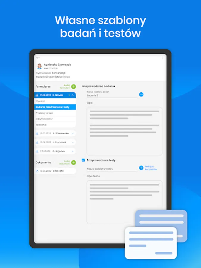 RSQ Physio is an intuitive medical documentation in electronic form for physiotherapists. It is here that you can prepare your appointment schedule in a clear and transparent way, conduct a thorough interview with the patient and create your own research and test template.