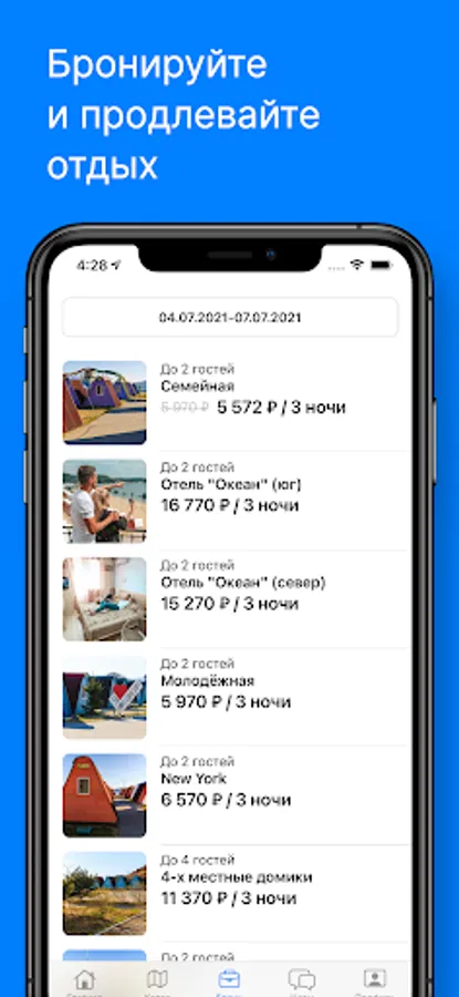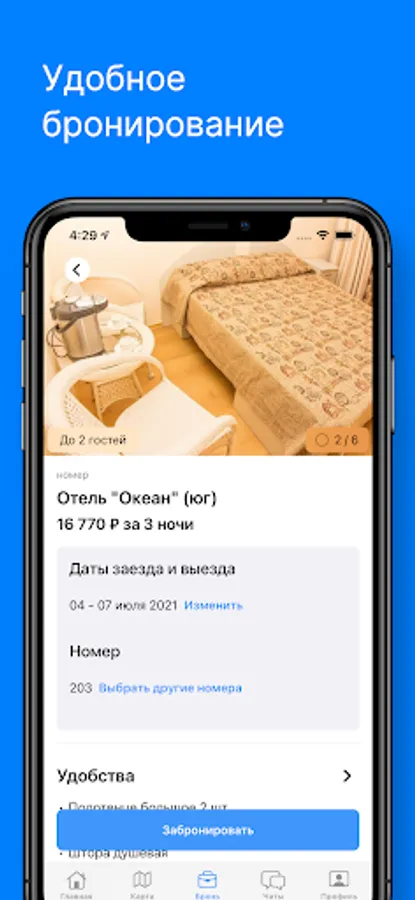 First of all, the application allows you to book the selected room or house in the area you like. A description of each zone and rooms / houses can be seen on the screen, revealing detailed information about them. Among other things, you can familiarize yourself with the equipment of the room with amenities and additional services included in its price.