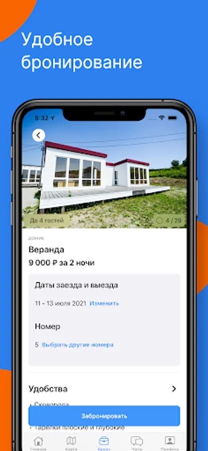 To get started, the application should be installed in order to learn more about the base and book a room or a house on its territory. Each type of residence is described in detail. The description includes services that are included in the price of rooms and their equipment, as well as the location at the base.