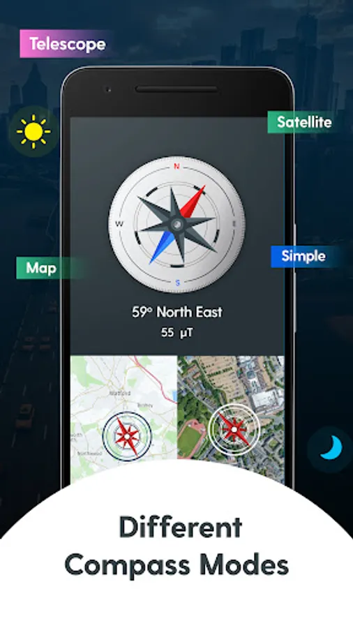 Get different modes of compass with navigation like Standard, Map, Satellite, Telescope, Compass modes.