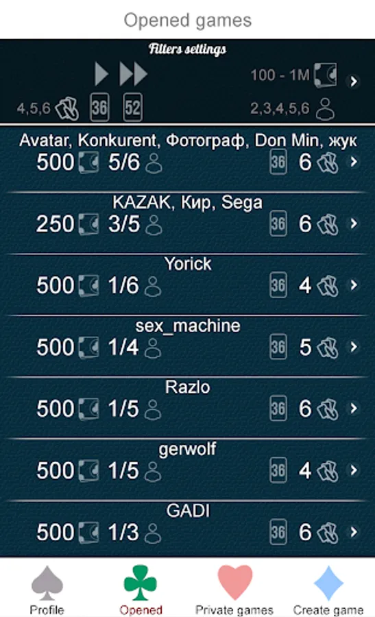 Create games with a password, invite your friends and play together. When creating a game without a password, any player who is in the game online can join you to play the fool. If you want to play with friends, then create a game with a password and invite them to it. If you want to not only play with friends, but also let other people in to fill all the empty places, then just open the game by clicking on the button.