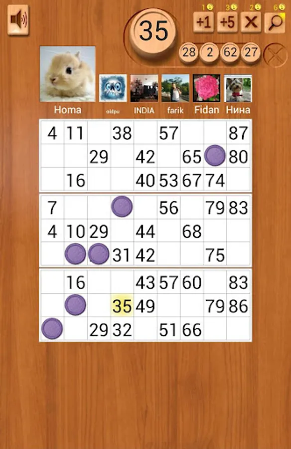 At the beginning of the game all players receive three cards with numbers from 1 to 90. During the game the barrels with numbers are getting out of the bag randomly. Players are closing numbers, if they are on the card.