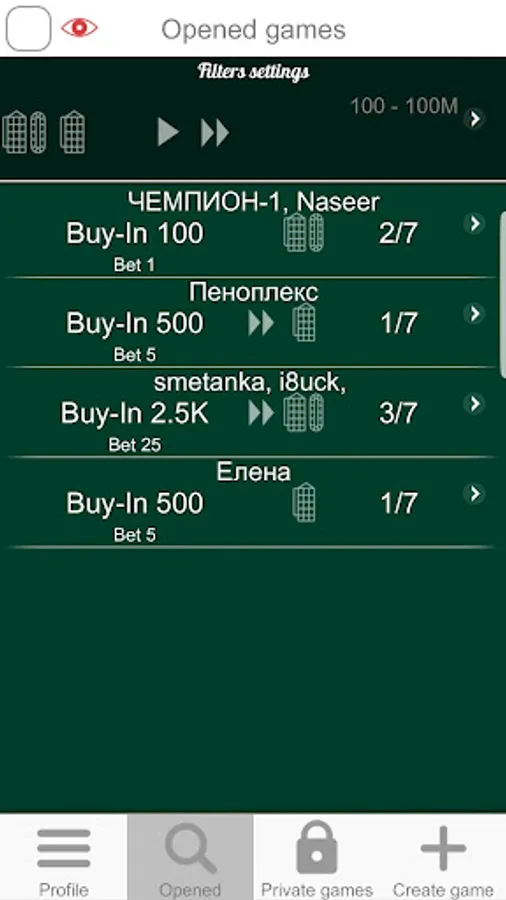 Create games with a password, invite your friends and play together. When creating a game without a password, any player who is in the game online can join you to play poker. If you want to play with friends, then create a game with a password and invite them to it. If you want to not only play with friends, but also let other people in to fill all the empty places, then just open the game by clicking on the button.