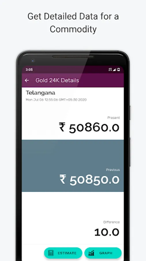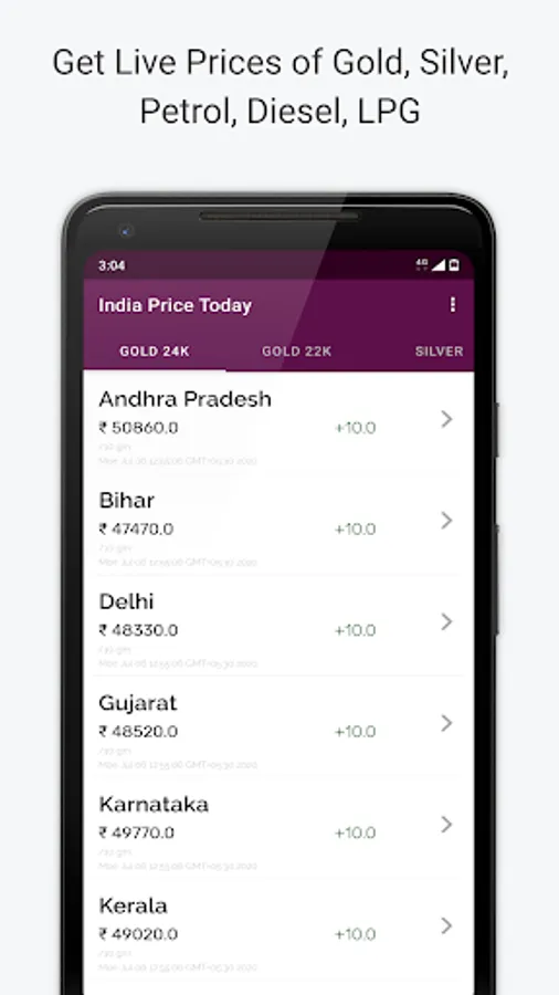 India Price Today has the latest market price and trends of gold, silver, fuel, etc in India. The app gives a detailed and latest information about the prices in main regions in Indian market and also a estimator to estimate the price of a resource.The India Price Today app is developed by an Indie developer that gives today's price for different resources with below features: