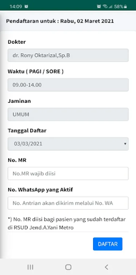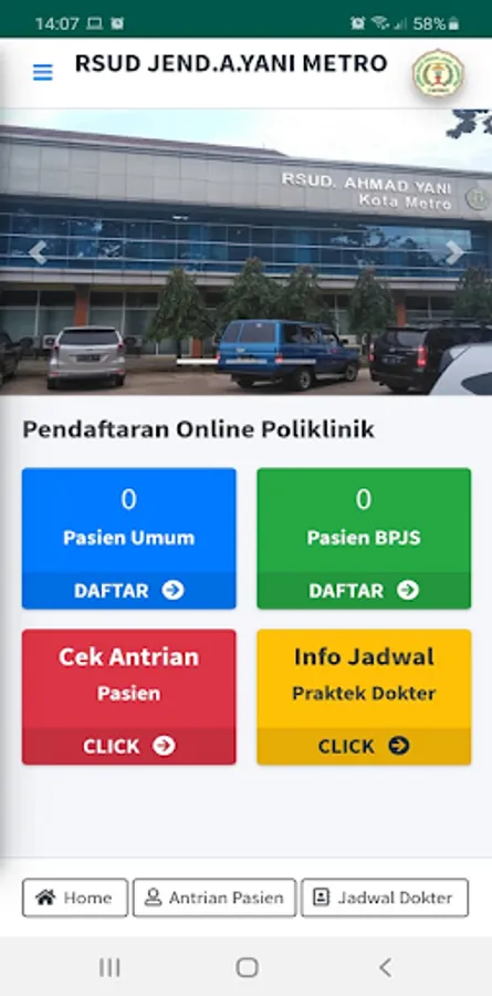 Polyclinic or Outpatient Online Registration for General Patients and BPJS who are already registered or new patients at Ahmad Yani Hospital, Metro Lampung