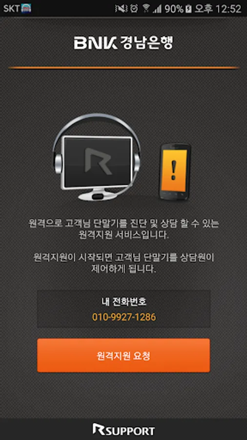 경남은행 원격 상담은 Android OS 기반의 모바일에 문제가 발생했을 때 상담원 PC와 연결하여 신속하게 진단/해결할 수 있는 원격지원 도구입니다.