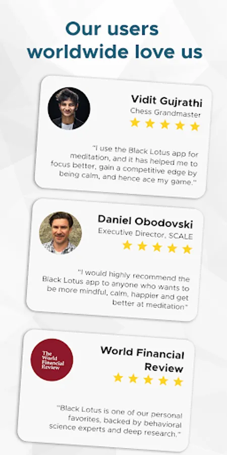 1 million lives touched, 250K impact stories, and 500K hours of user meditation hours locked in the app. Black Lotus helps you with stress management, better sleep, techniques to relax and unwind. Use the app for free and witness the impact in the first few days of usage itself.