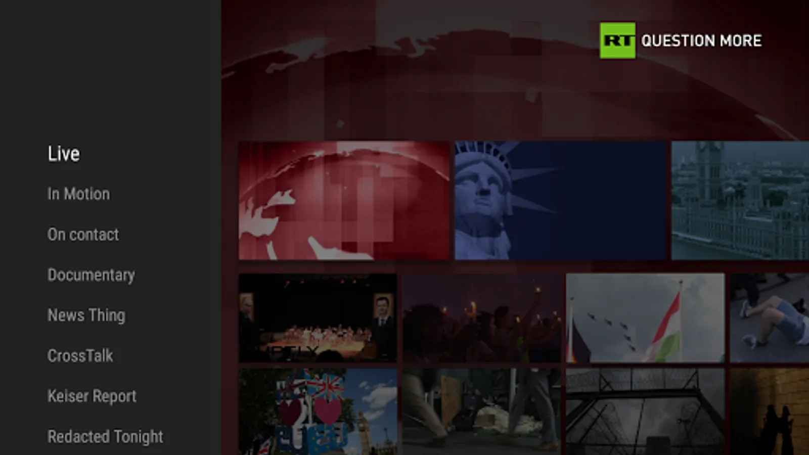 RT is a 24/7 English-language news channel. We are set to show you how any story can be another story altogether. Broadcasting over six continents and 100 countries, our coverage focuses on international headlines, giving an innovative angle set to challenge viewers worldwide.