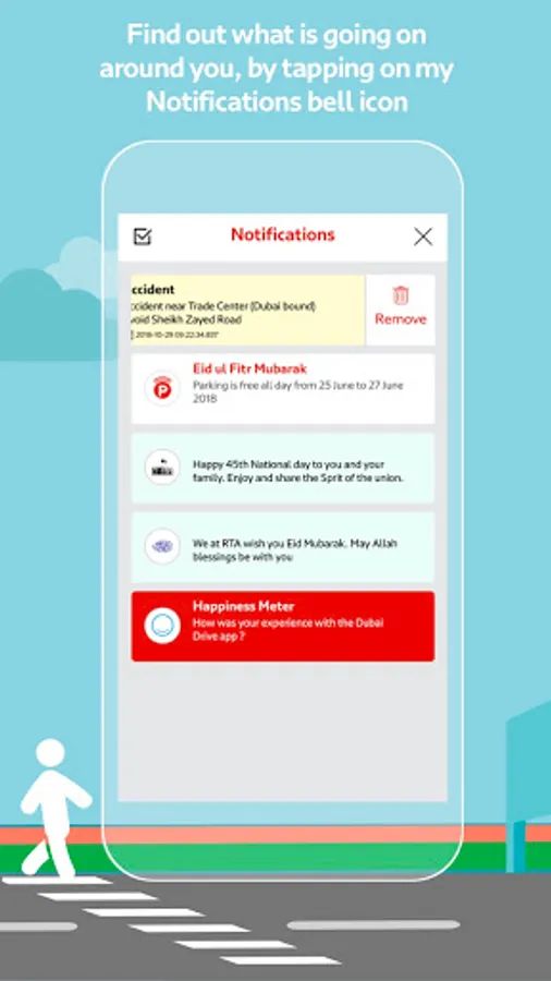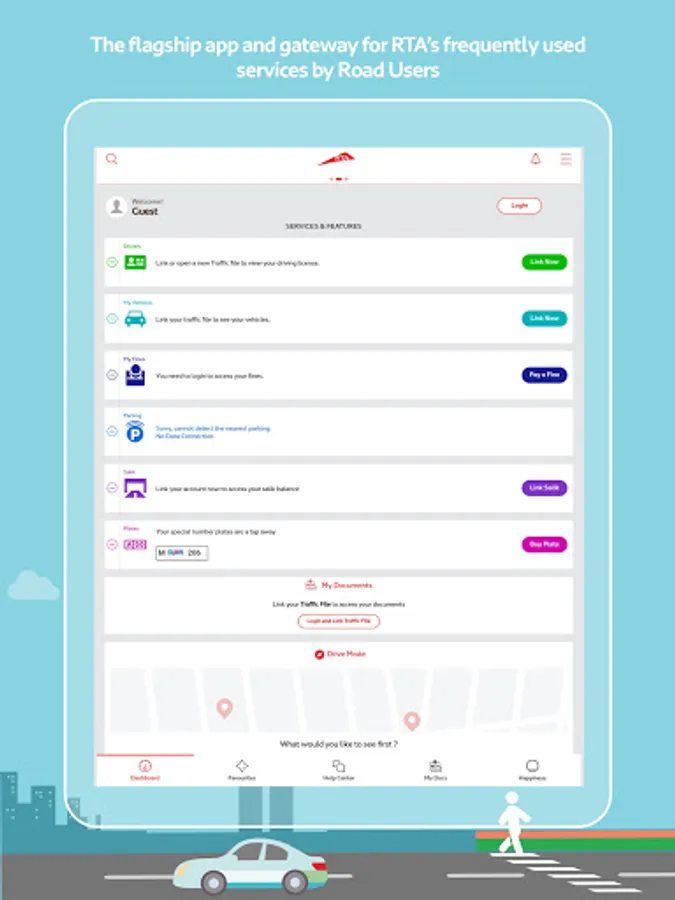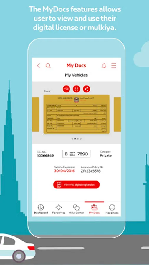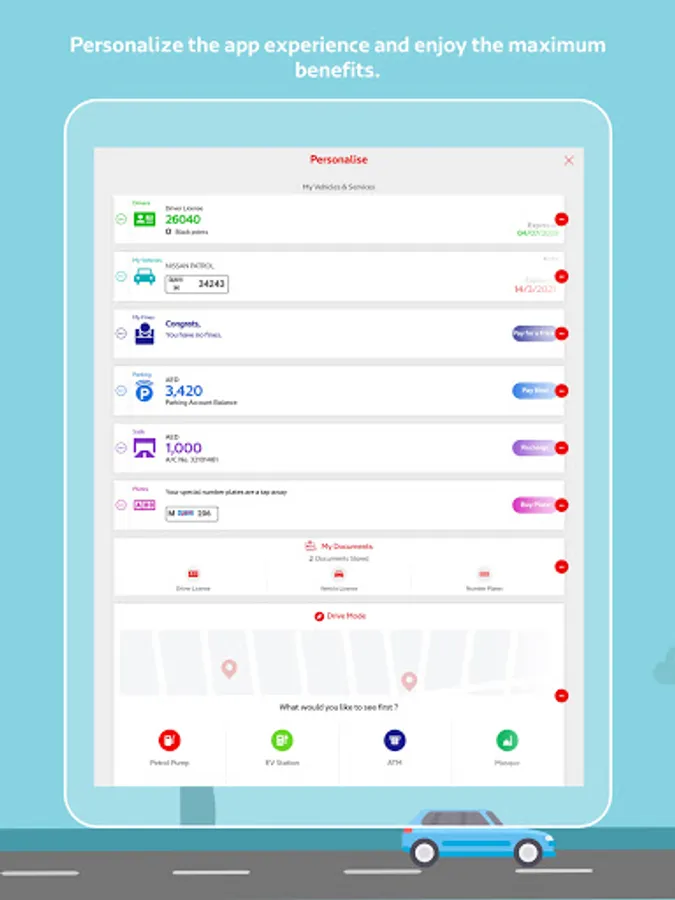 • “My Docs” providing a digital version of your valid driver’s license, vehicle registration cards & purchased special car plate number certificates, you can use this as an official document with other entities such as Dubai Police