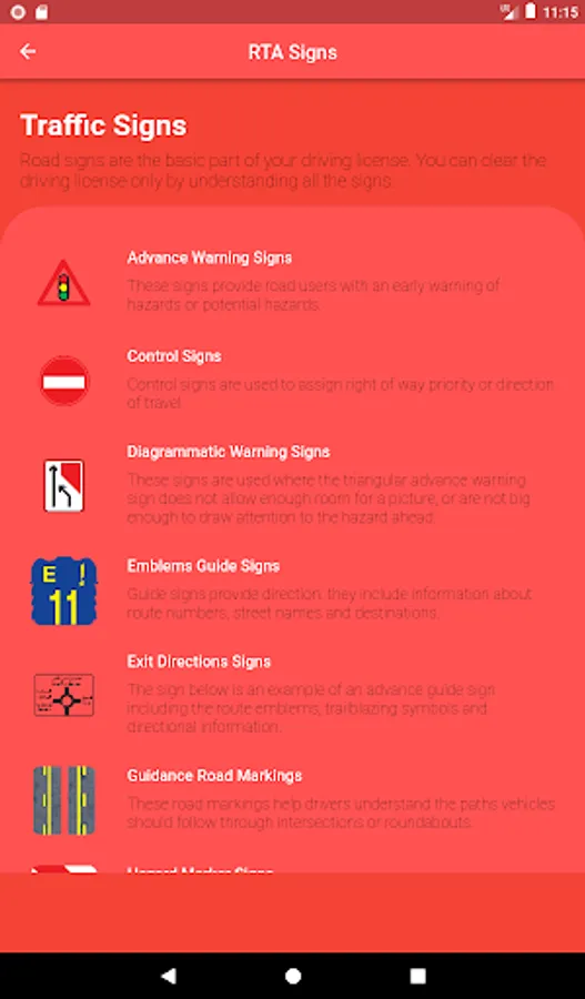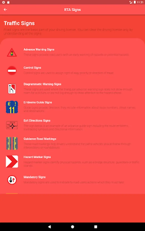 RTA Signal Test اشارات السير app offers you all the traffic signs that you need to understand to pass your practical test. You can learn about all the traffic signs. There is a detailed description of every sign. Once you go through traffic signs then try rta signal test practice.
