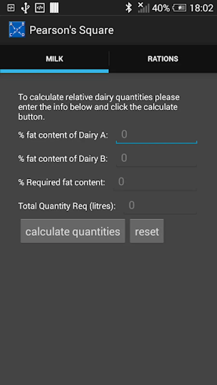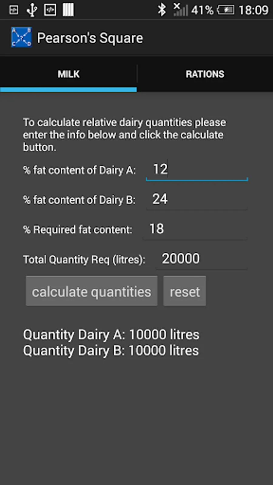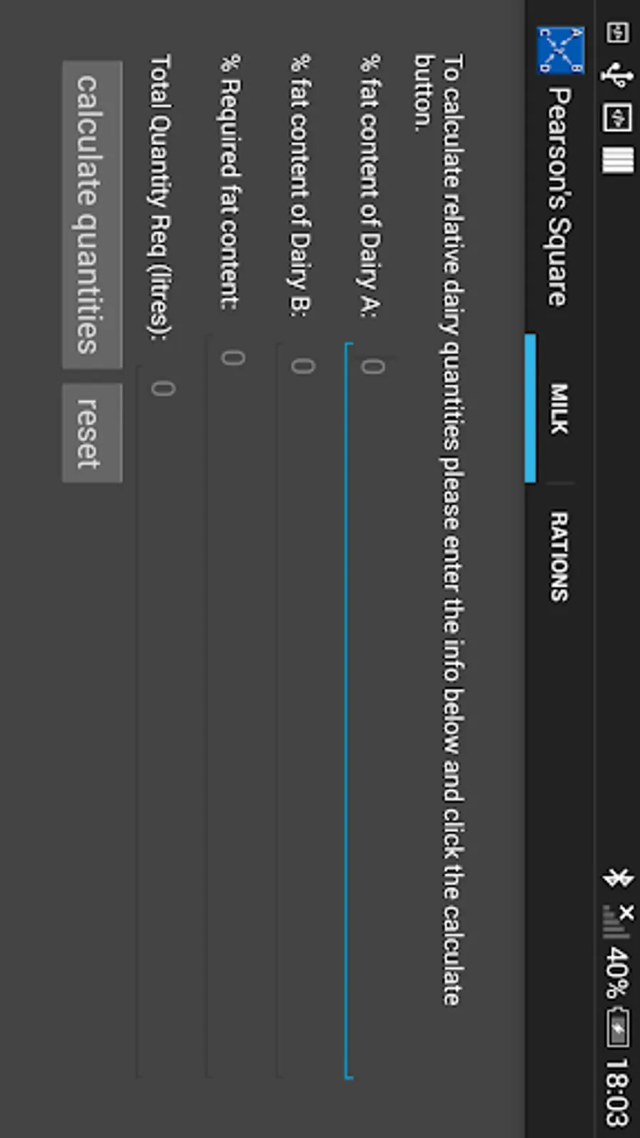 A useful implementation of Pearson's Square that enables users to quickly and easily calculate the required quantities of dairy products or protein foodstuffs to create the exact mix required. This app will soon be updated with the ability to calculate costs as well as to email or SMS results through to a co-worker.