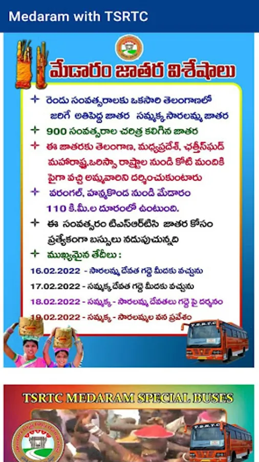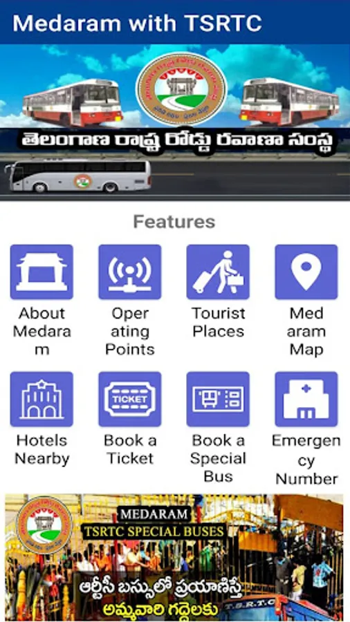 It provides information on TSRTC special buses to public who want to travel to Medaram Jathara from different places of Telangana and neighboring states. It also provides emergency contact information and tourist spots near medaram and the hotels nearby. It navigates people to medaram and provides TSRTC bus and ticket booking facility.