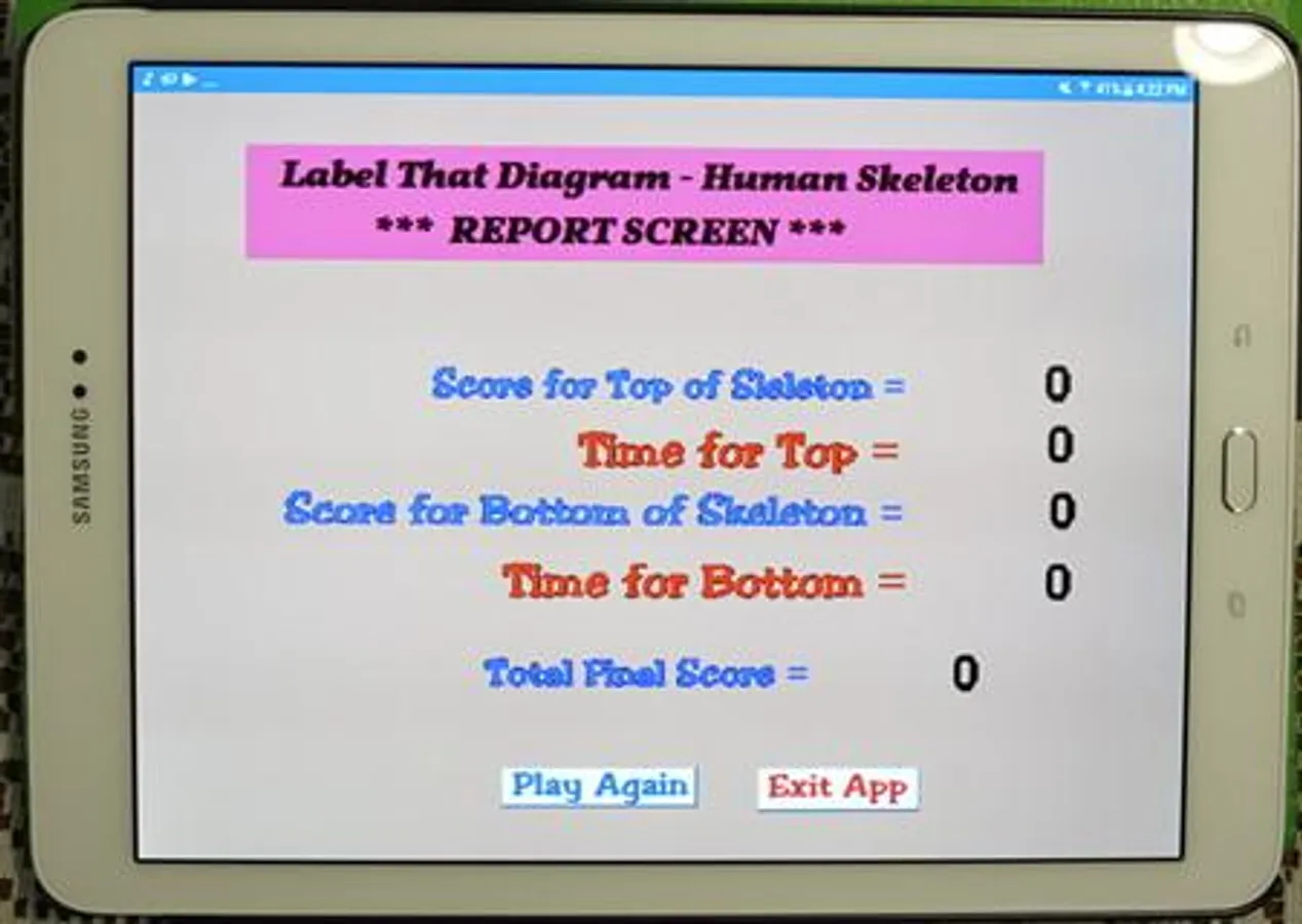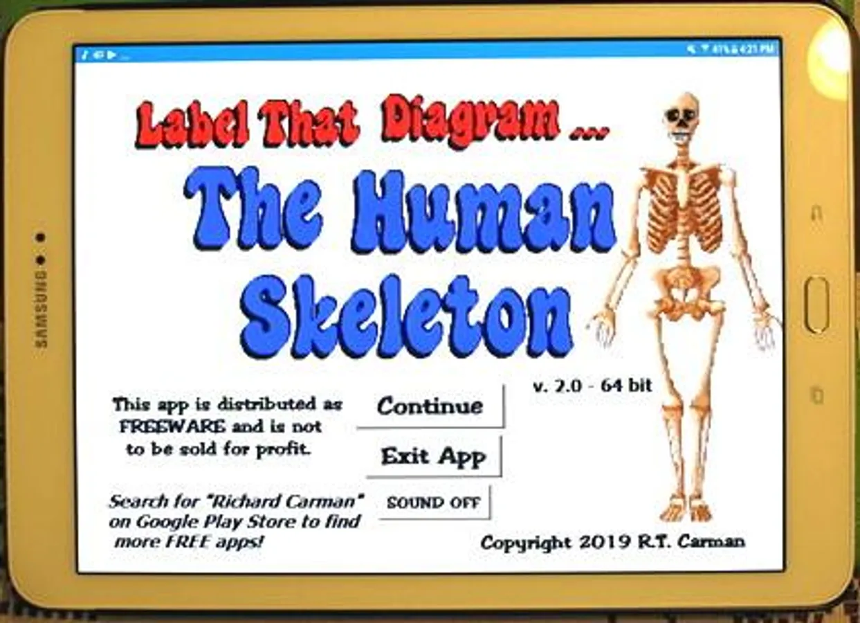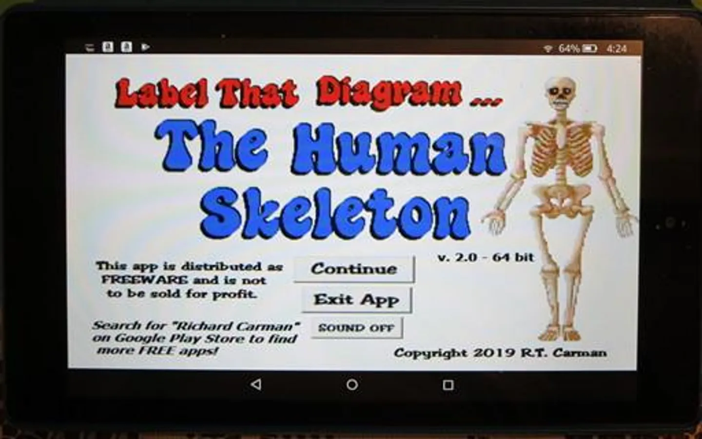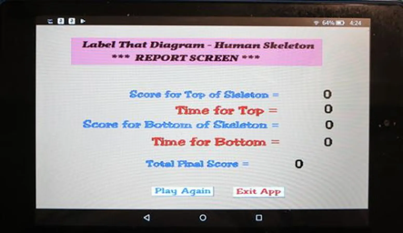 Label That Diagram - SKELETON: v2.0-64 This app lets you practice identifying 20 bones of the human body. There are three main screens to the app. Screen 1 presents a labeled diagram of the human skeleton and indicates the bones covered in this app. One screen allows the user to identify bones in the upper body and another screen covers the lower body. There is a report screen at the end of the game. A stylus works best for use on small screens. The app is small and simple but will let the user get a good foundational understanding of the skeleton on which to build. The app is totally free and asks for no permissions from your device. Music and sound effects are played and can be muted. There is no internet connection needed to play this app and there are no advertisements.