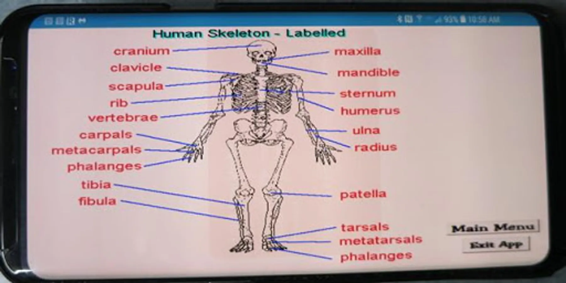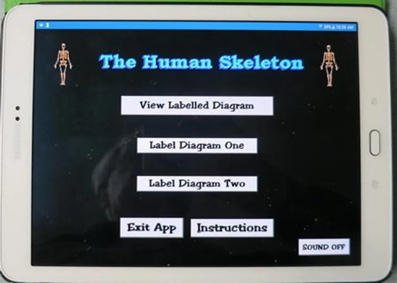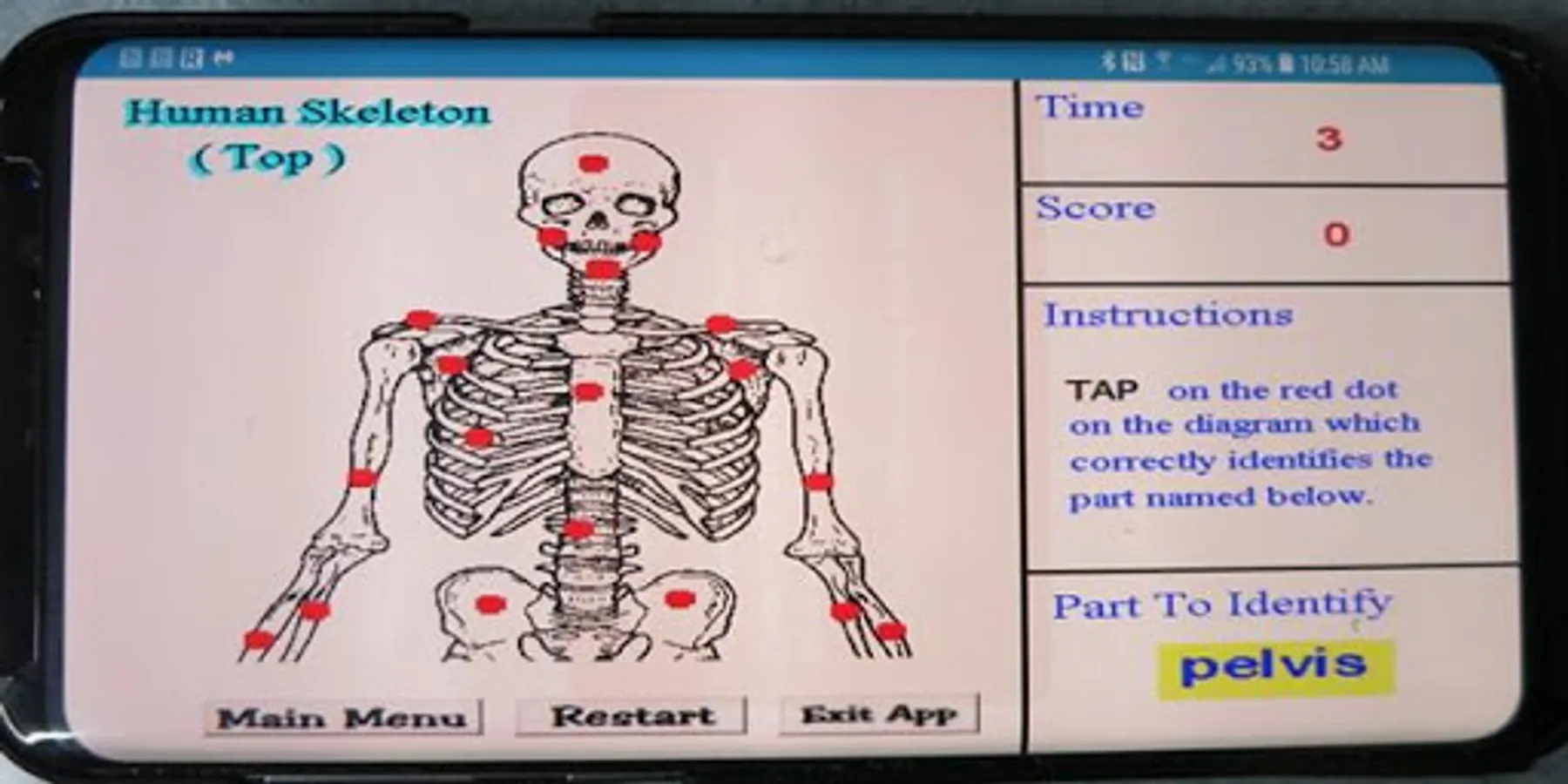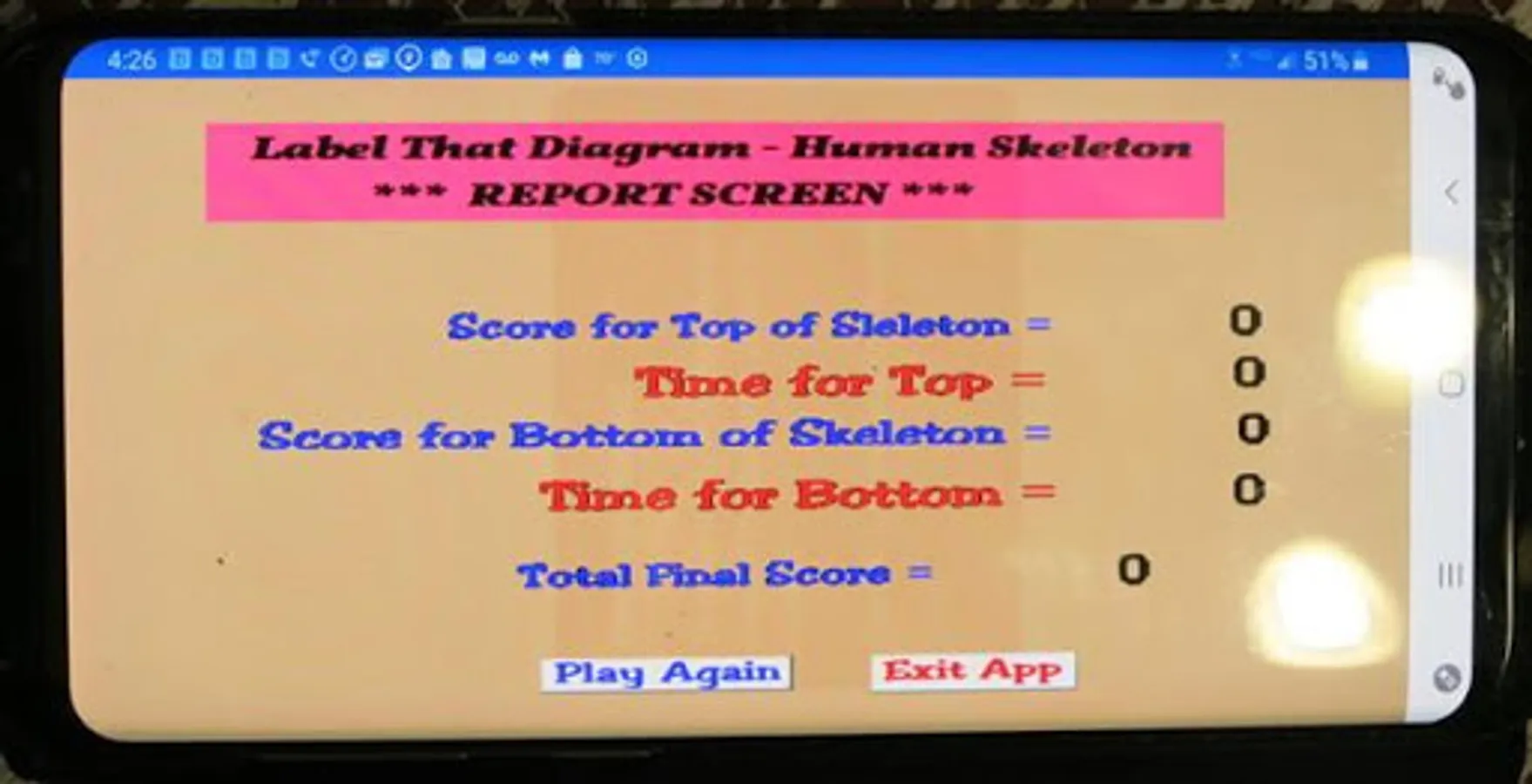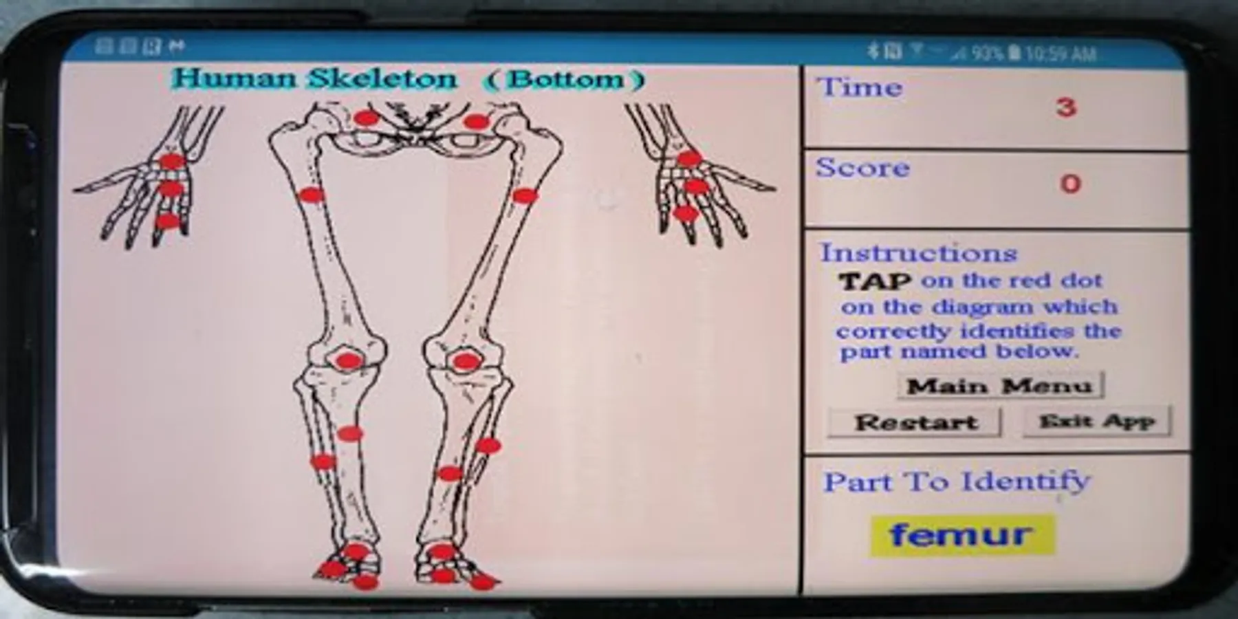 Label That Diagram - SKELETON: v2.0-64 This app lets you practice identifying 20 bones of the human body. There are three main screens to the app. Screen 1 presents a labeled diagram of the human skeleton and indicates the bones covered in this app. One screen allows the user to identify bones in the upper body and another screen covers the lower body. There is a report screen at the end of the game. A stylus works best for use on small screens. The app is small and simple but will let the user get a good foundational understanding of the skeleton on which to build. The app is totally free and asks for no permissions from your device. Music and sound effects are played and can be muted. There is no internet connection needed to play this app and there are no advertisements.