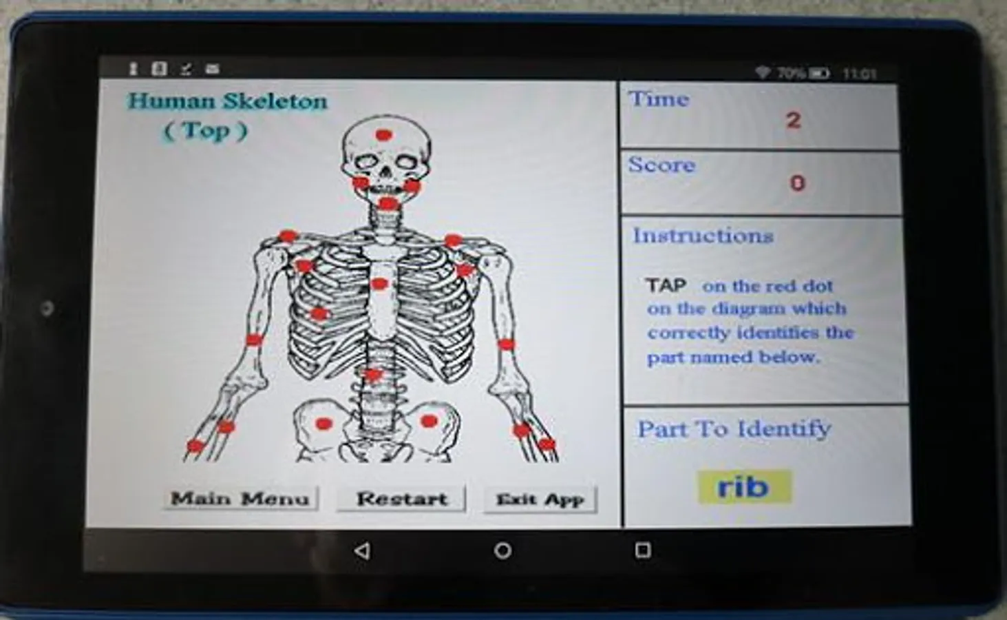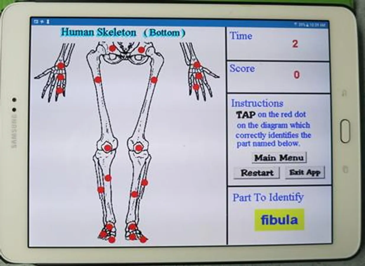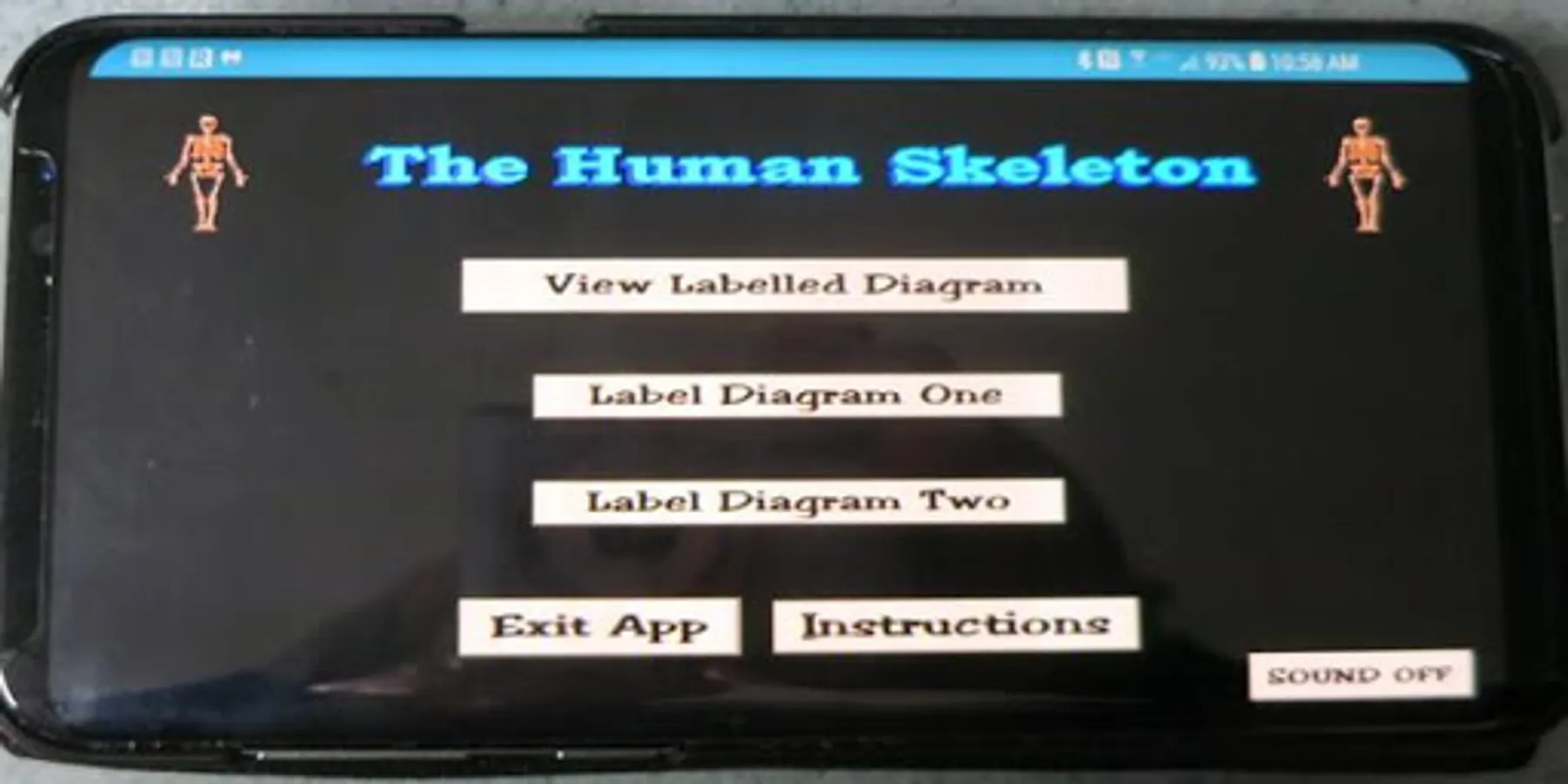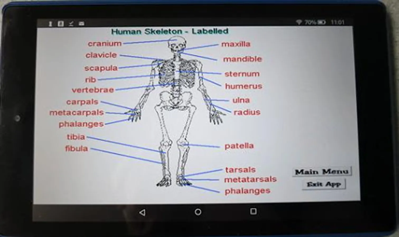 Label That Diagram - SKELETON: v2.0-64 This app lets you practice identifying 20 bones of the human body. There are three main screens to the app. Screen 1 presents a labeled diagram of the human skeleton and indicates the bones covered in this app. One screen allows the user to identify bones in the upper body and another screen covers the lower body. There is a report screen at the end of the game. A stylus works best for use on small screens. The app is small and simple but will let the user get a good foundational understanding of the skeleton on which to build. The app is totally free and asks for no permissions from your device. Music and sound effects are played and can be muted. There is no internet connection needed to play this app and there are no advertisements.