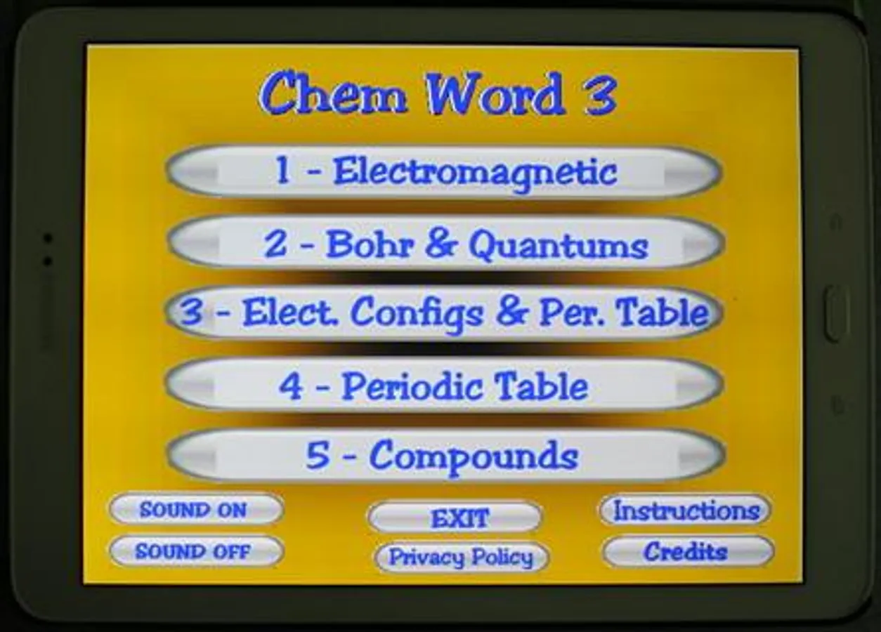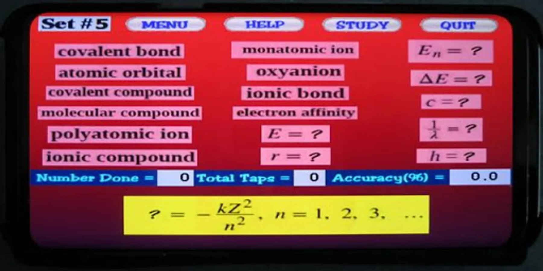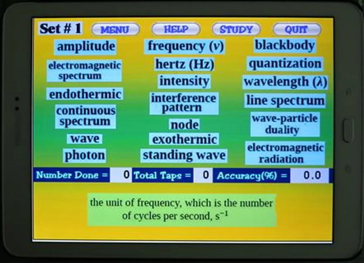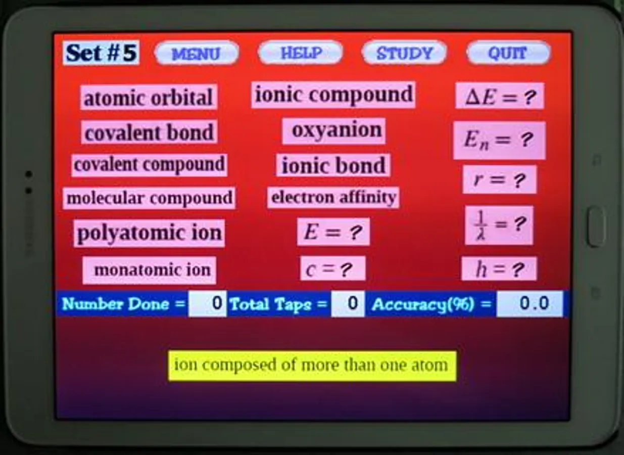 included in most Chemistry textbooks. The terms used in this app are based on the free chemistry e-book from OpenStax.org. There are 87 terms presented in 5 sets. Topics covered include electron configurations, orbitals, subshells, Bohr model, emr, periodic table details, etc. The user must select the term that matches a given definition. Each word set has a Study Screen for the user to read and review the information. Visit OpenStax.org to download FREE textbooks!