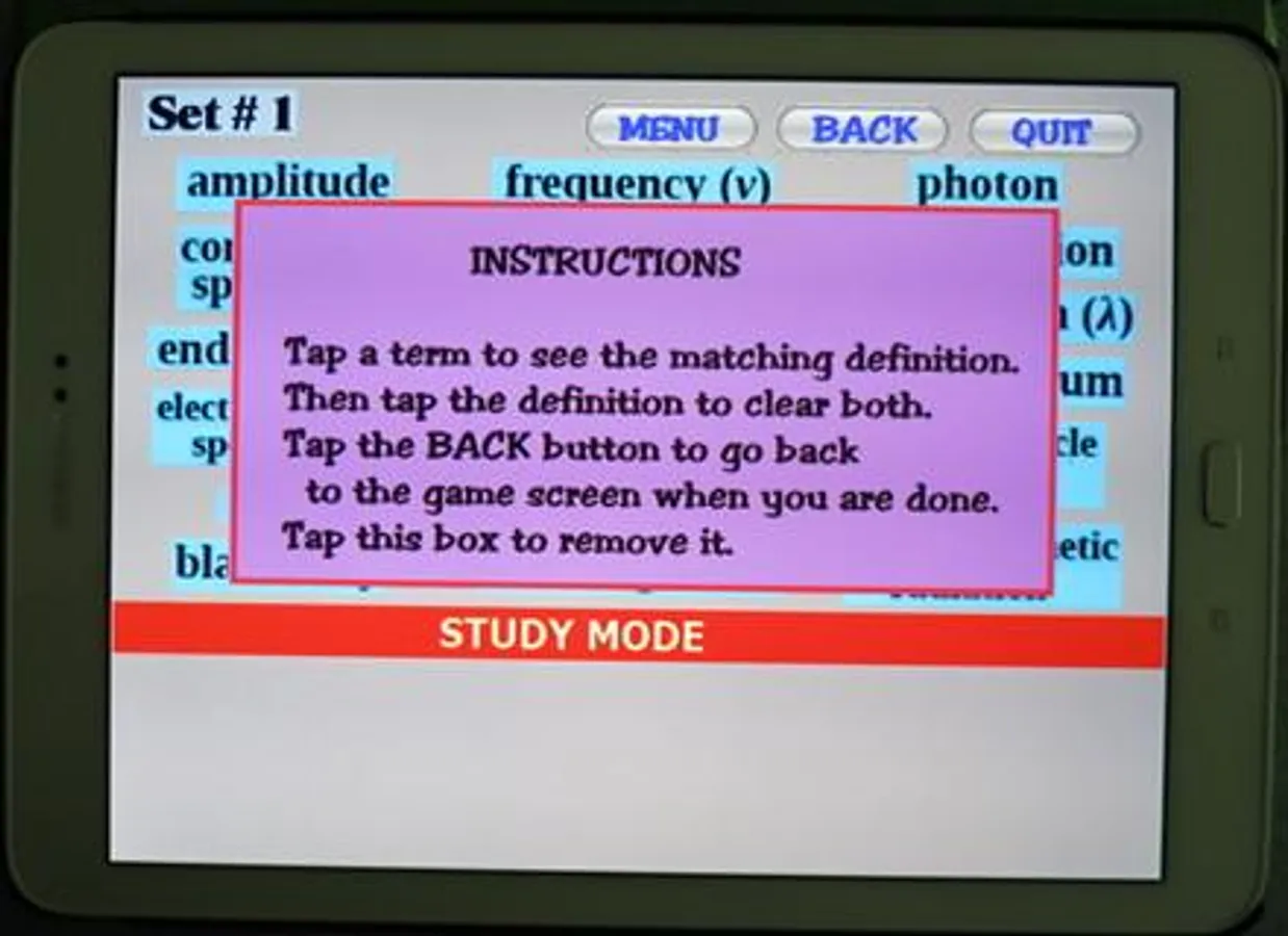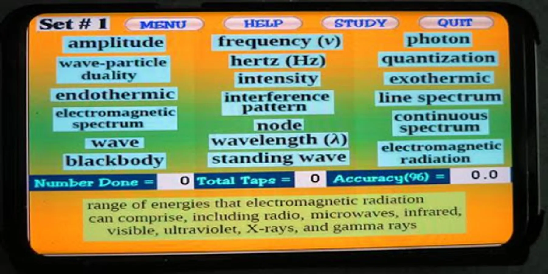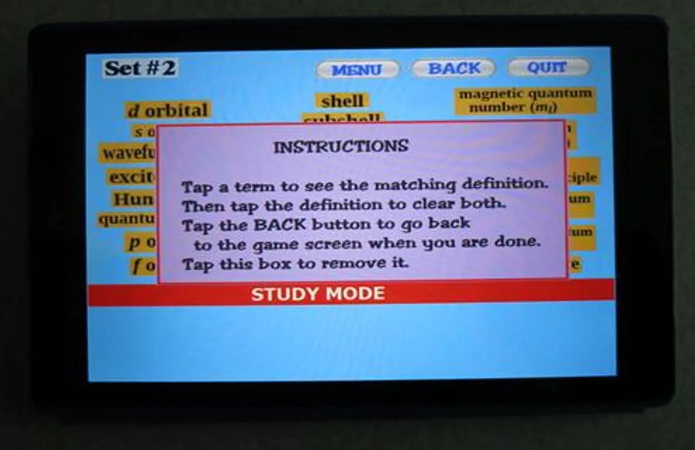 included in most Chemistry textbooks. The terms used in this app are based on the free chemistry e-book from OpenStax.org. There are 87 terms presented in 5 sets. Topics covered include electron configurations, orbitals, subshells, Bohr model, emr, periodic table details, etc. The user must select the term that matches a given definition. Each word set has a Study Screen for the user to read and review the information. Visit OpenStax.org to download FREE textbooks!