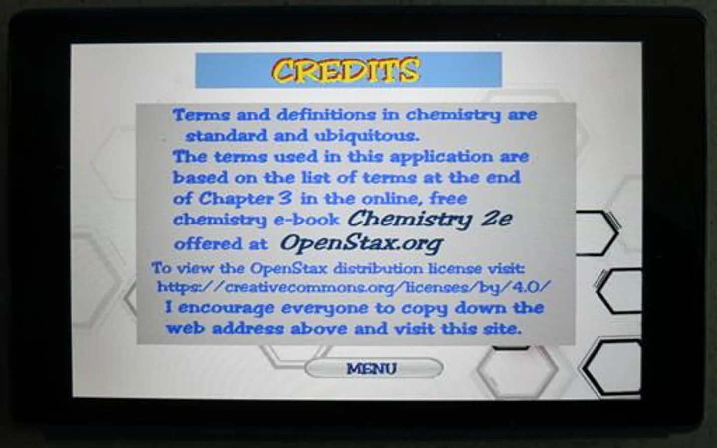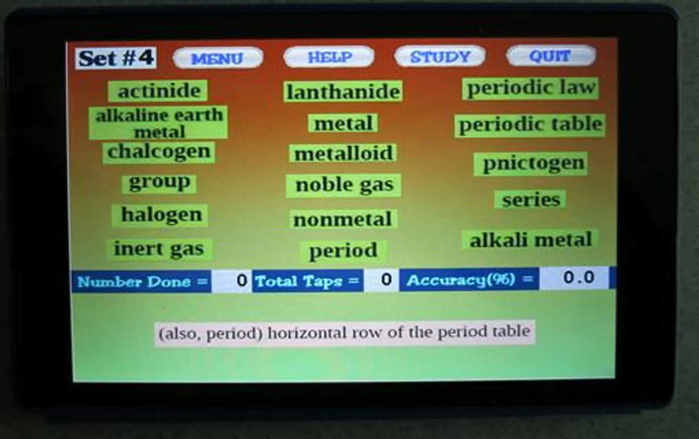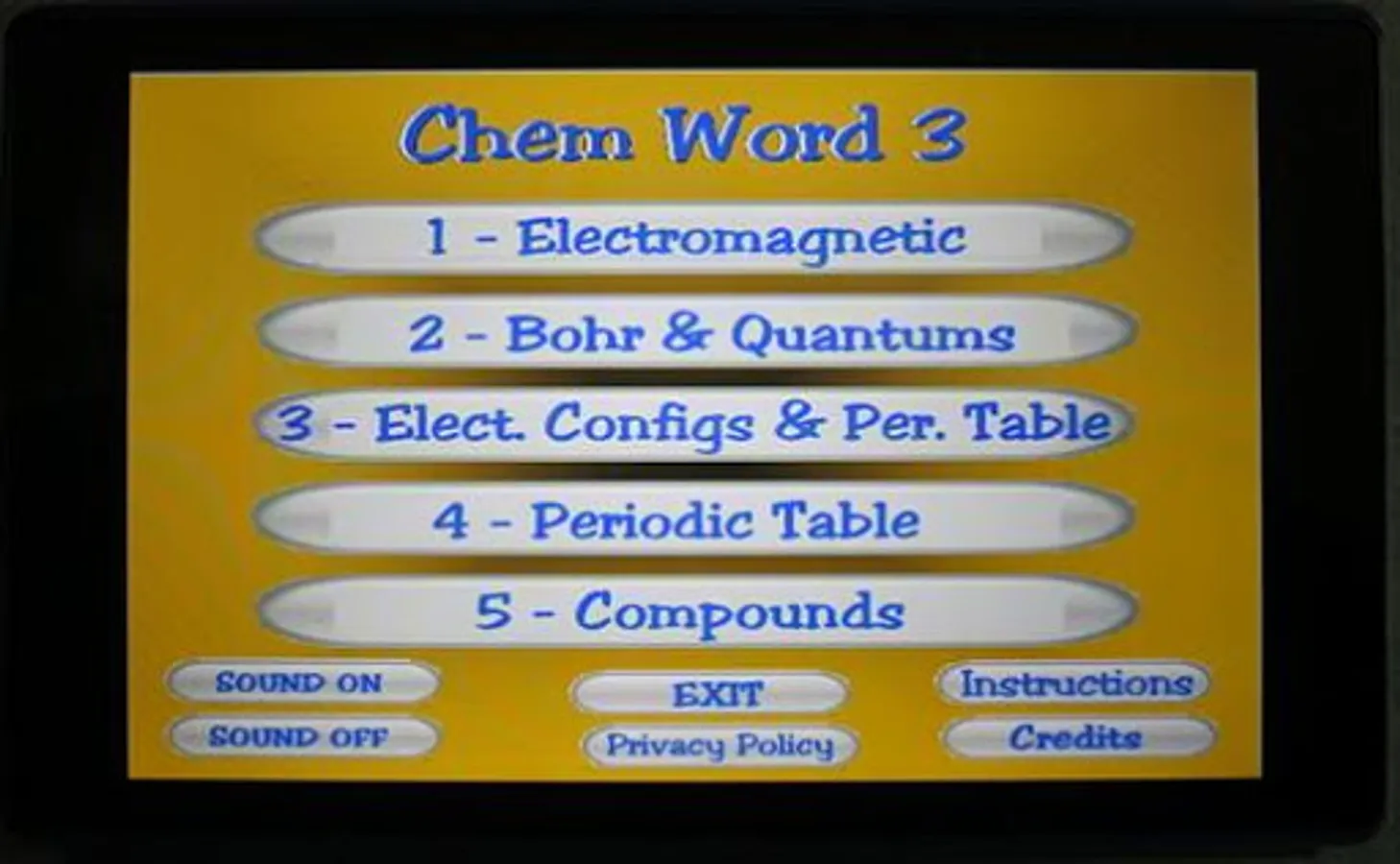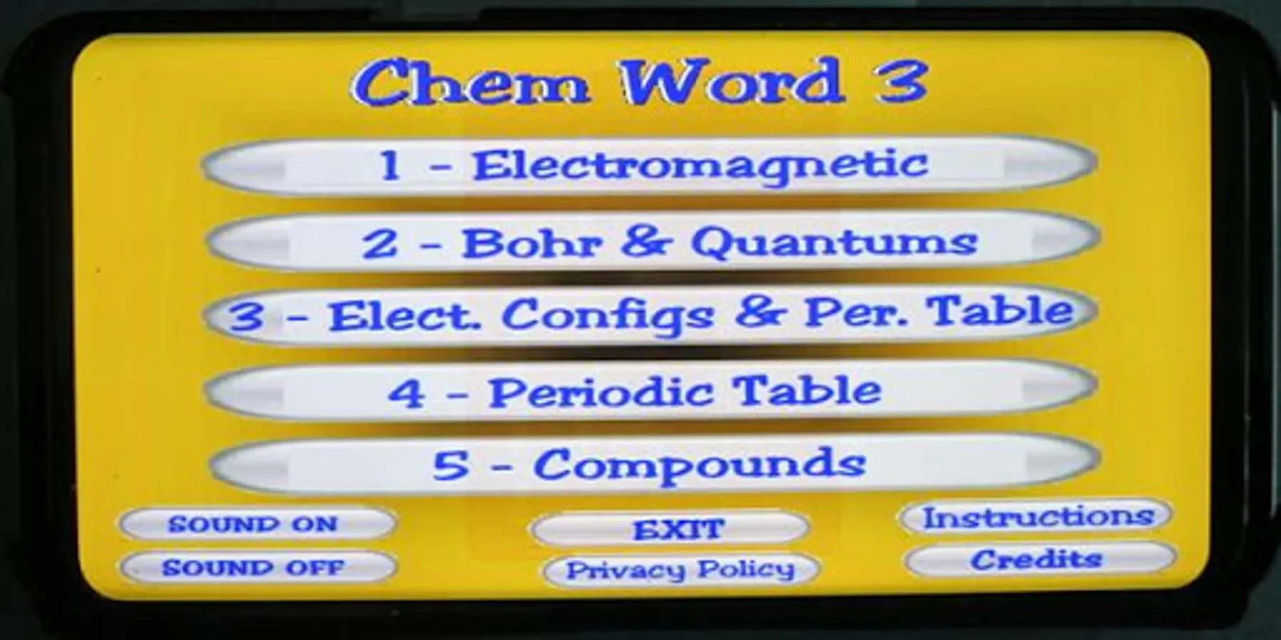 included in most Chemistry textbooks. The terms used in this app are based on the free chemistry e-book from OpenStax.org. There are 87 terms presented in 5 sets. Topics covered include electron configurations, orbitals, subshells, Bohr model, emr, periodic table details, etc. The user must select the term that matches a given definition. Each word set has a Study Screen for the user to read and review the information. Visit OpenStax.org to download FREE textbooks!