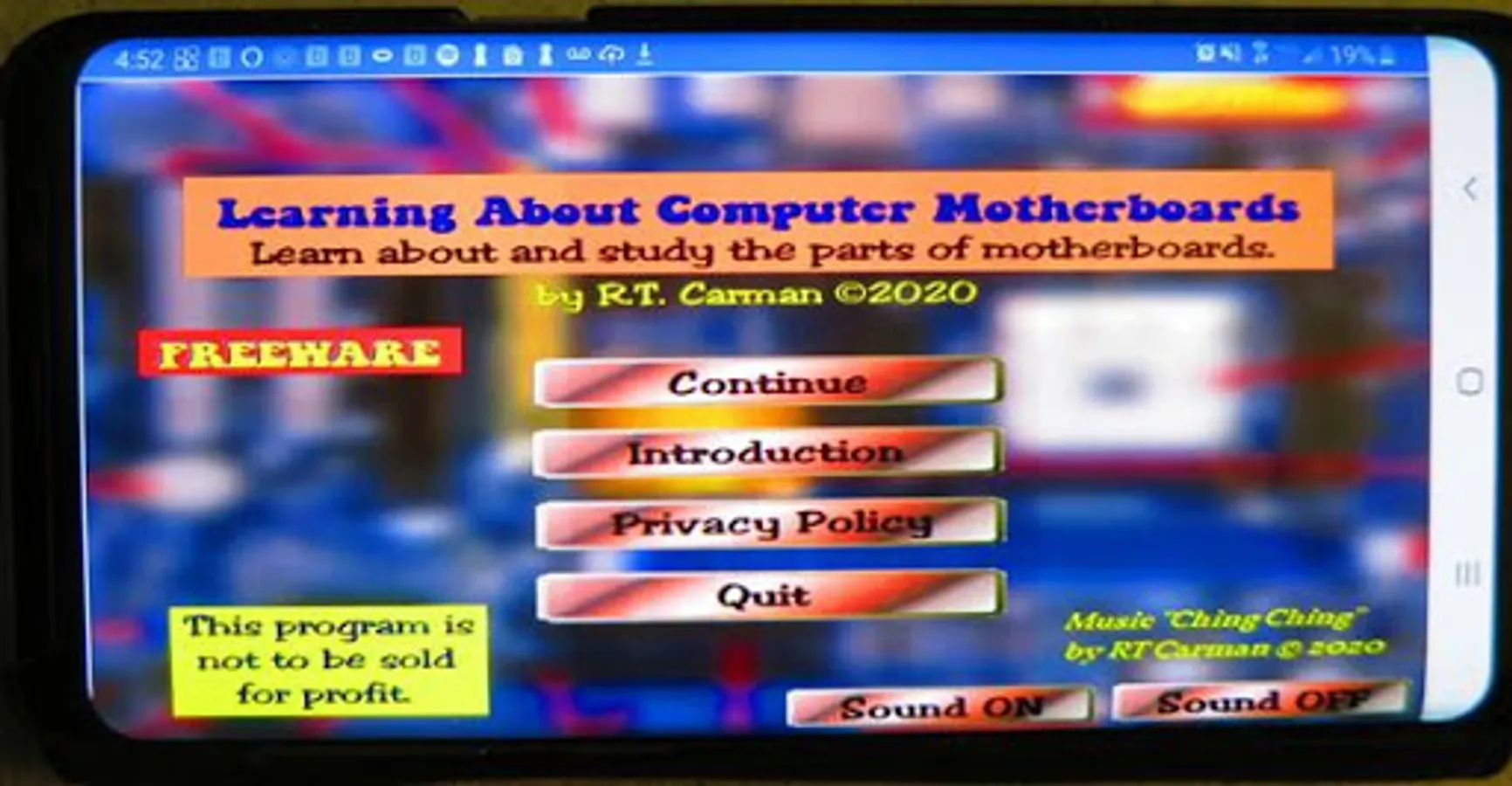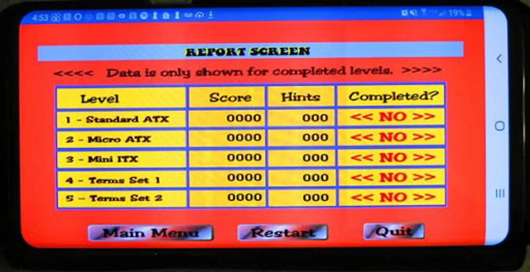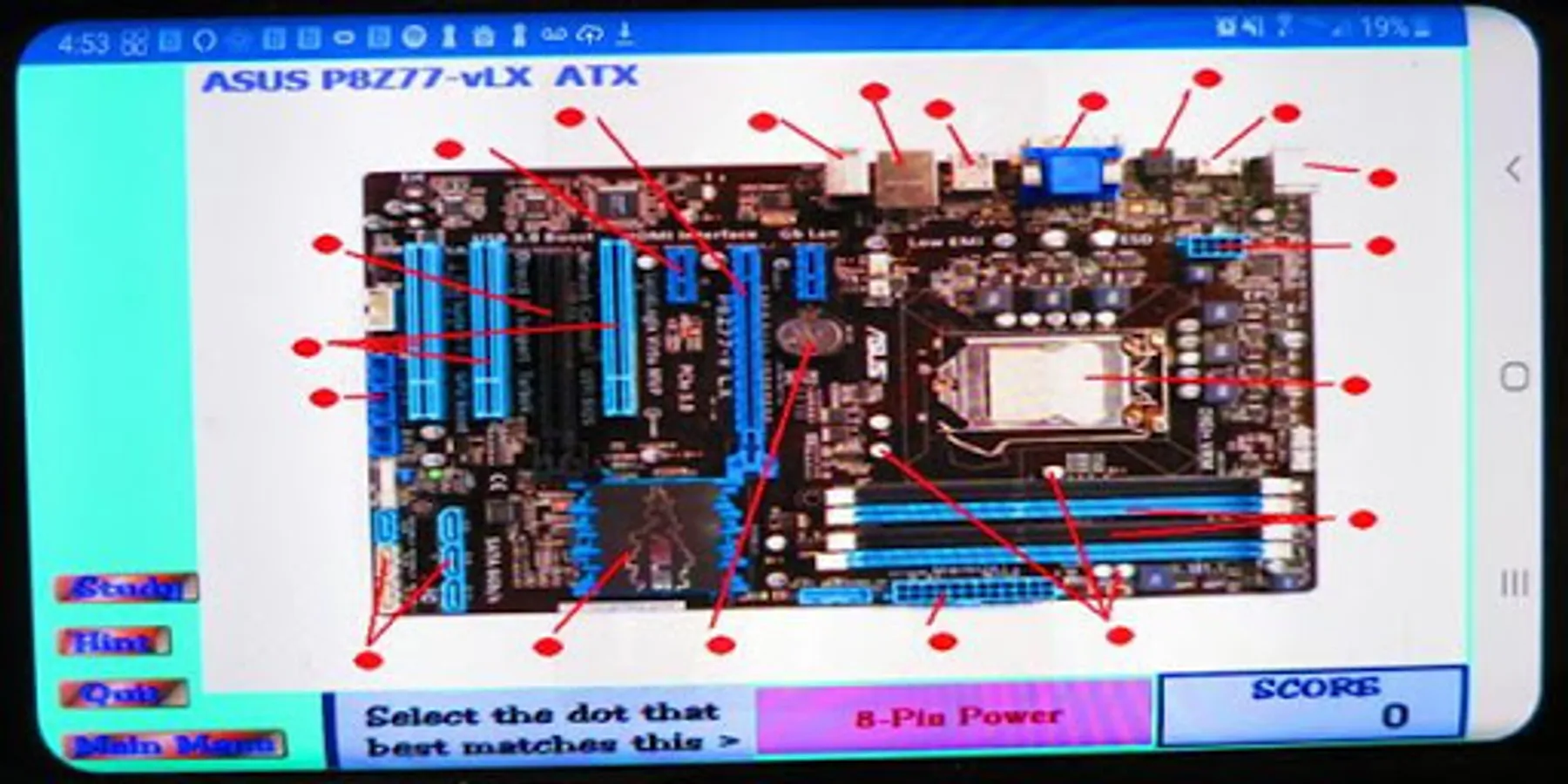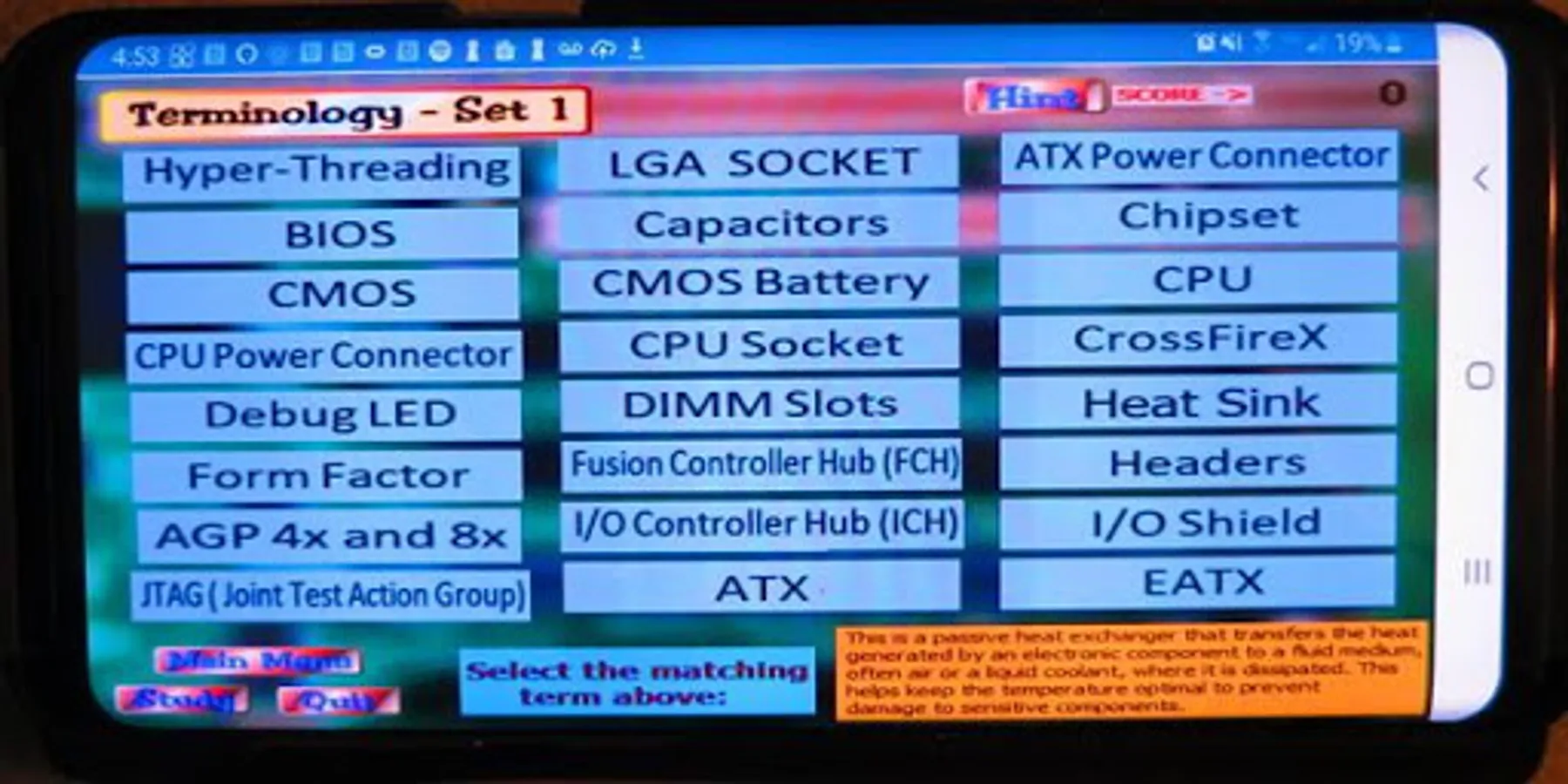 All five screens have a "Study" button. Selecting the "Study" button on the motherboard image screens will turn off scoring and reveal all the labels. The user cannot play, but he can study the diagram. Knowledgeable users can do a screen capture and print the screen. Selecting the "Study" button on the terminolgy screen will let the user play the game with no score being recorded. The user can select the "Hint" button to reveal the answer after trying to recall it. Selecting the study message will resume the level from the beginning.