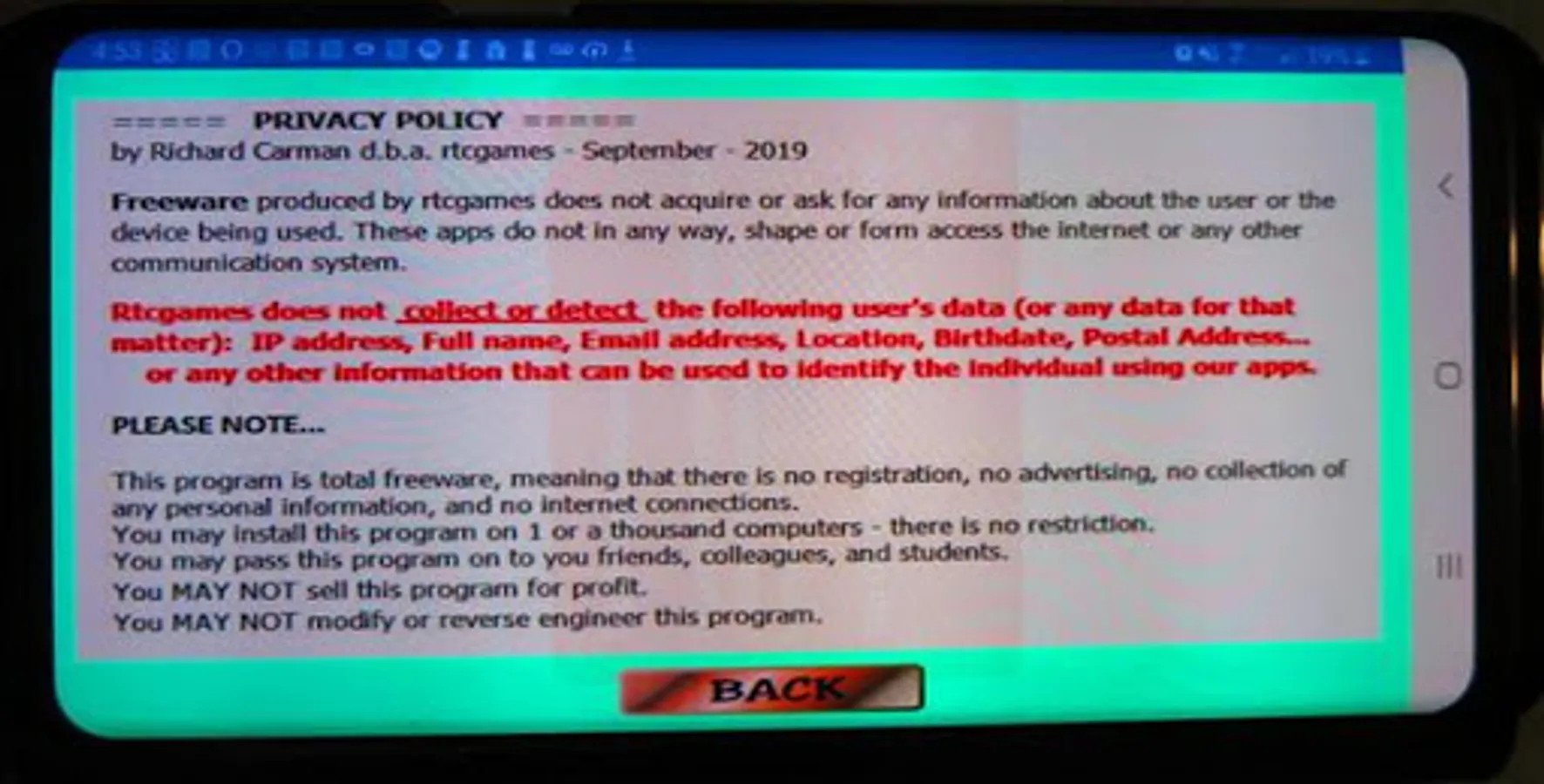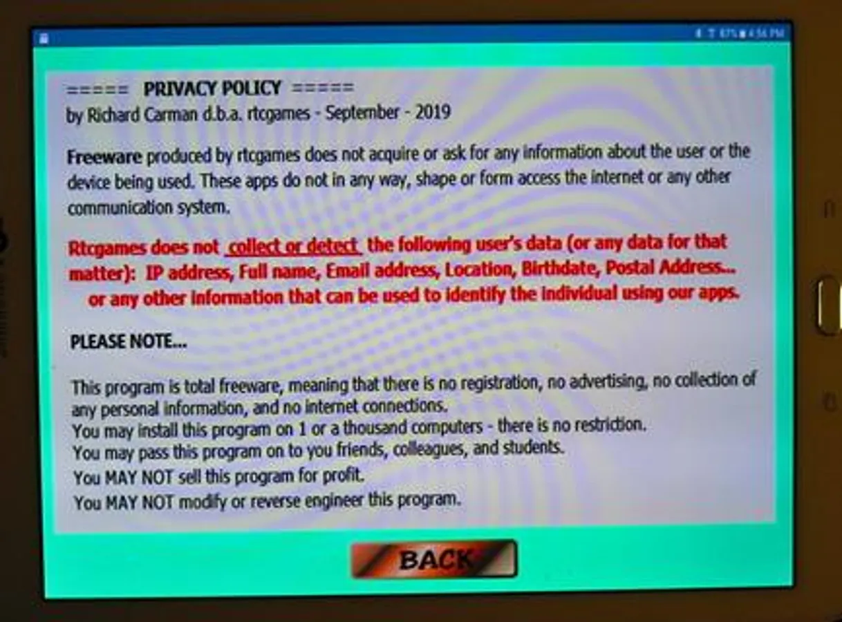 This application is TOTAL FREEWARE. This means it is free with no advertising, no collection of any personal data of any kind, no internet access, and no registration. It can be used in an environment which has no local network.