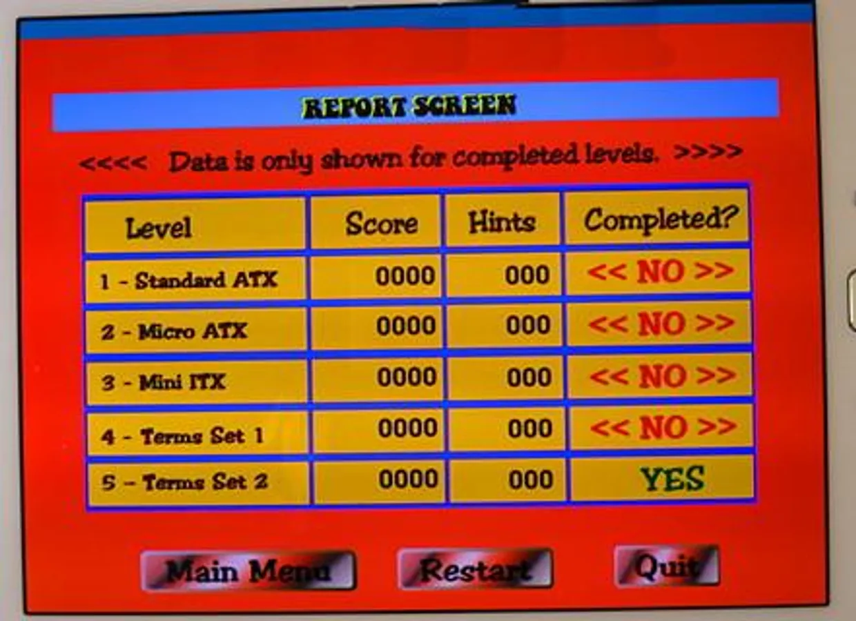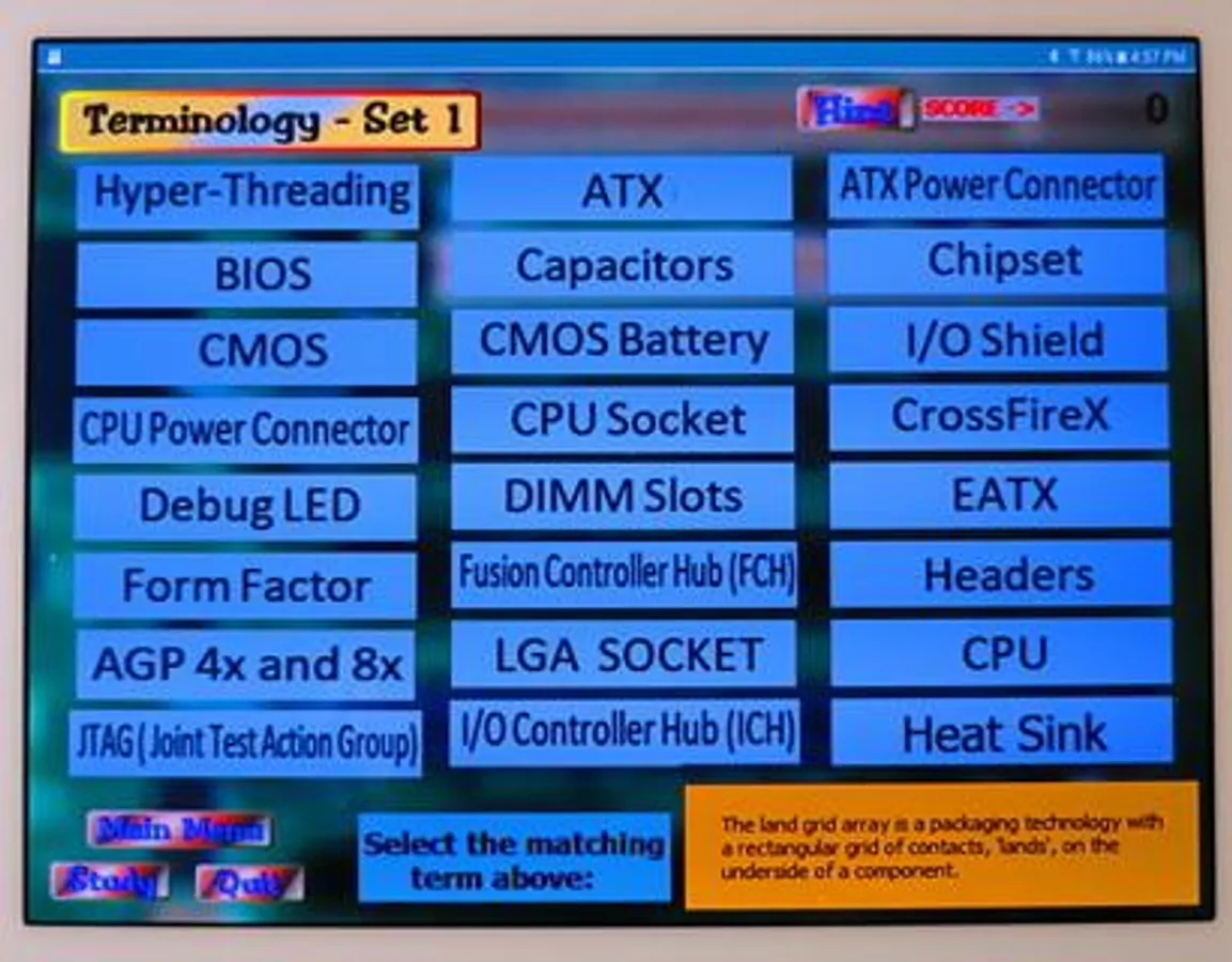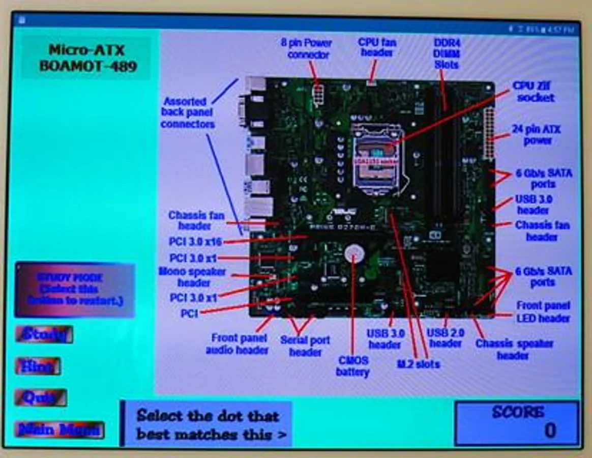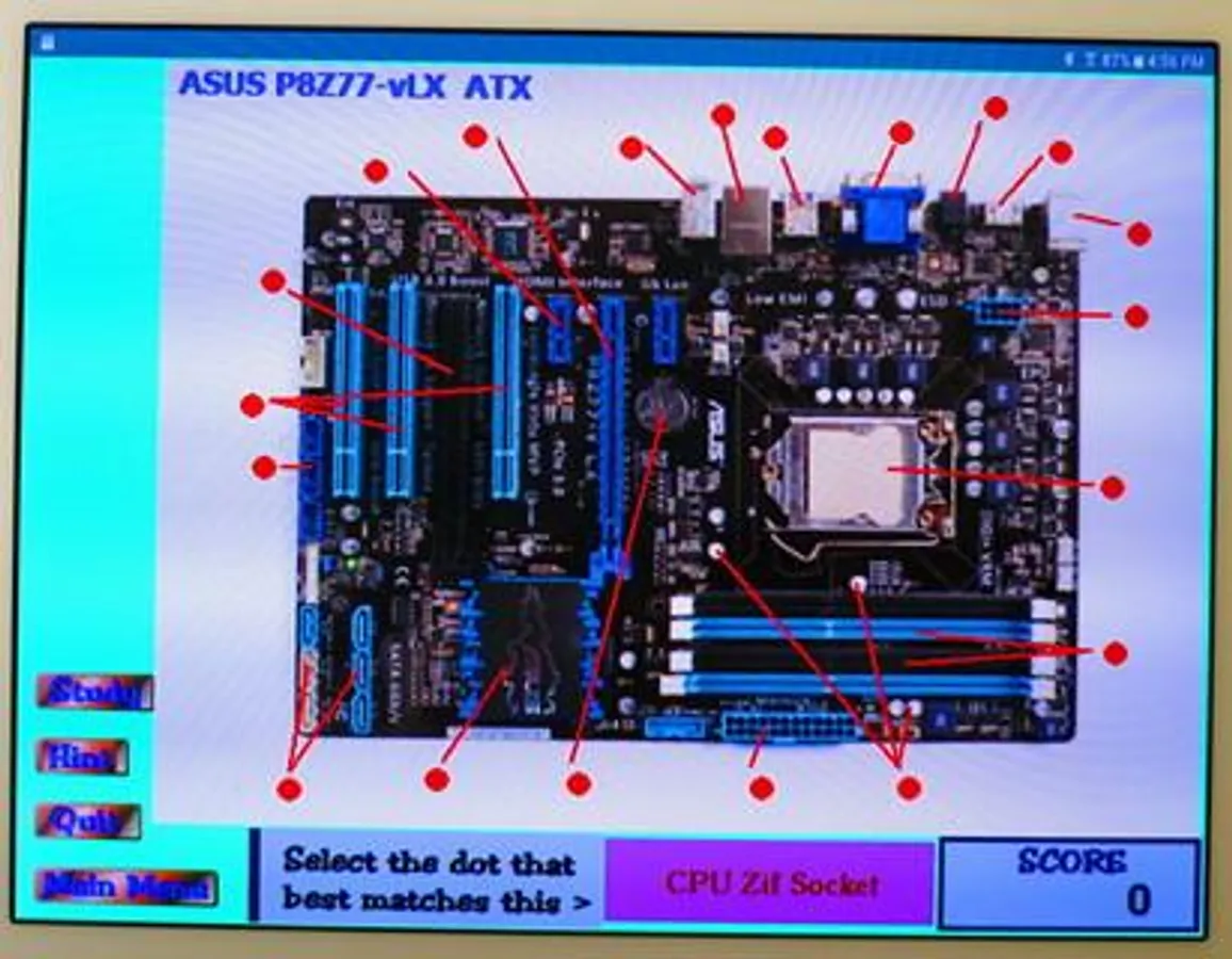 This FREEWARE application covers the diagrams of three common motherboard form-factors: ATX, micro-ATX, and Mini-ITX. It also covers the definition of 48 terms associated with the structure and fuctioning of the motherboard. The main part of the application consists of five screens; three labeled diagrams and two screens of terminology. The diagram screens present a picture of a motherboard with the labels covered by red dots. The name of a label apears on the screen and the user must identify the correct dot. There is a "Hint" button which will reveal the correct answer. The score and use of the hint button are tracked and presented on a "Report Screen" at the end of the application. The terminolgy screens show a set of terms and a definition appears on the screen. The user must select the best correct matching term.