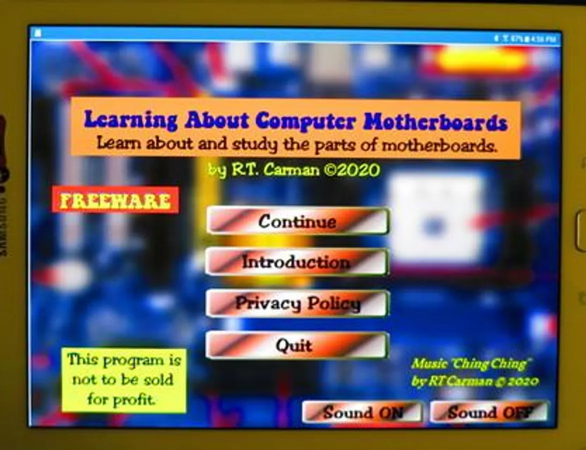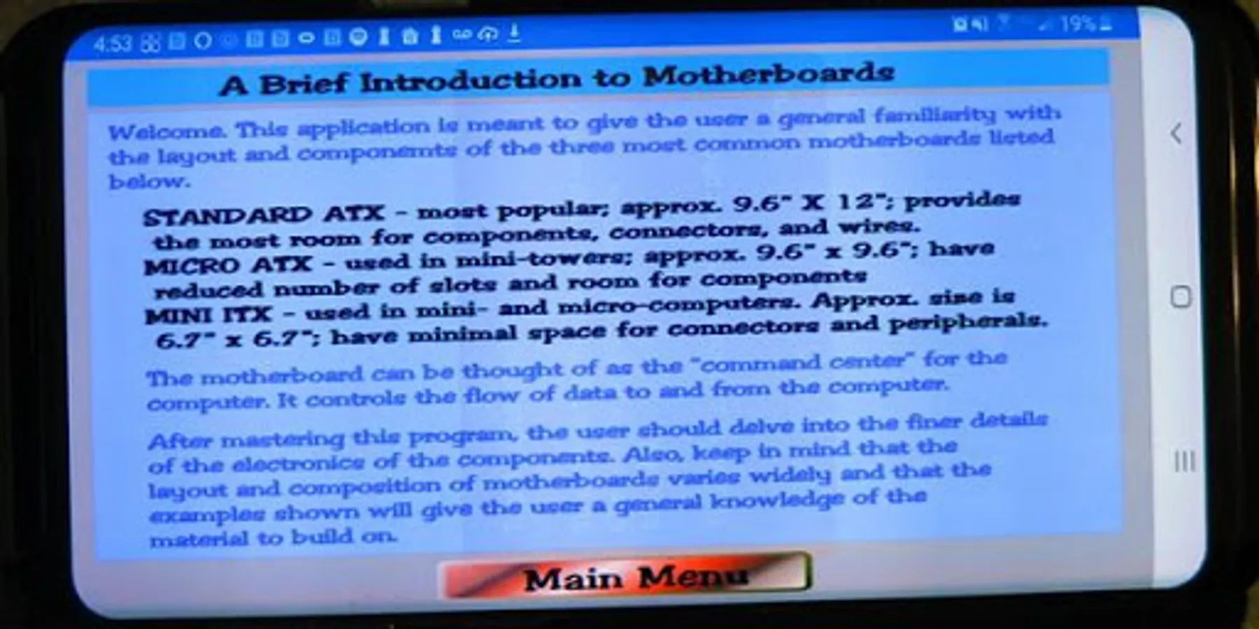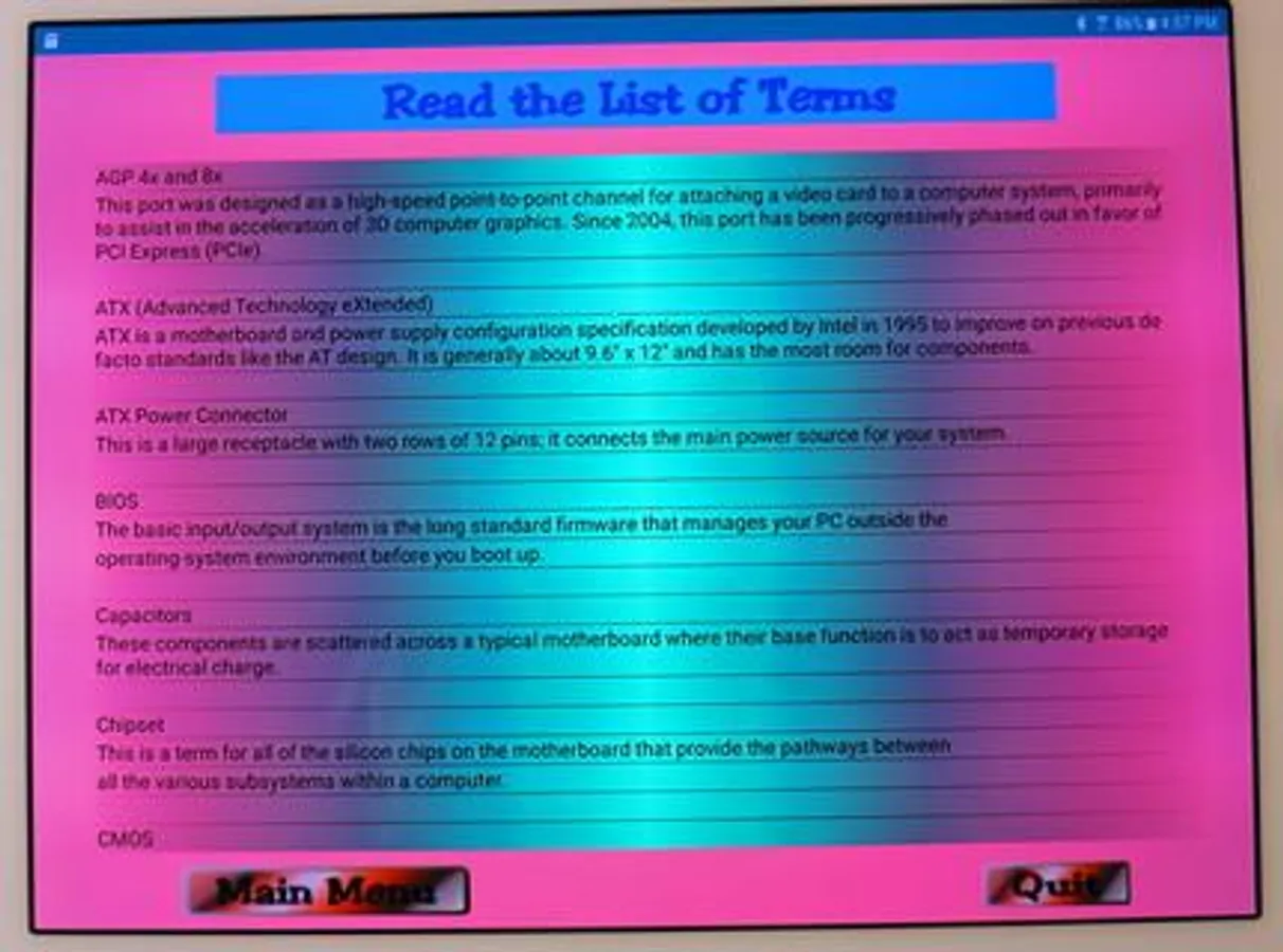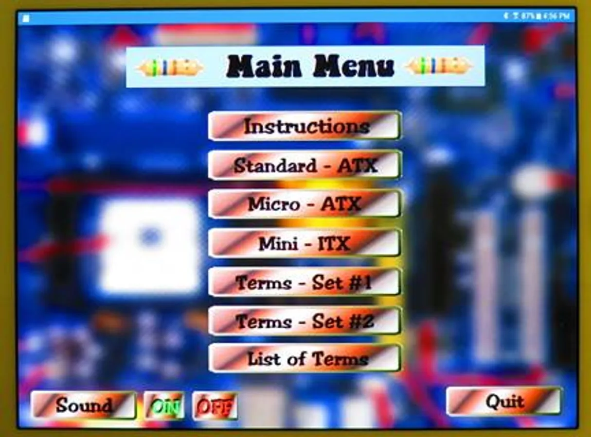 This FREEWARE application covers the diagrams of three common motherboard form-factors: ATX, micro-ATX, and Mini-ITX. It also covers the definition of 48 terms associated with the structure and fuctioning of the motherboard. The main part of the application consists of five screens; three labeled diagrams and two screens of terminology. The diagram screens present a picture of a motherboard with the labels covered by red dots. The name of a label apears on the screen and the user must identify the correct dot. There is a "Hint" button which will reveal the correct answer. The score and use of the hint button are tracked and presented on a "Report Screen" at the end of the application. The terminolgy screens show a set of terms and a definition appears on the screen. The user must select the best correct matching term.