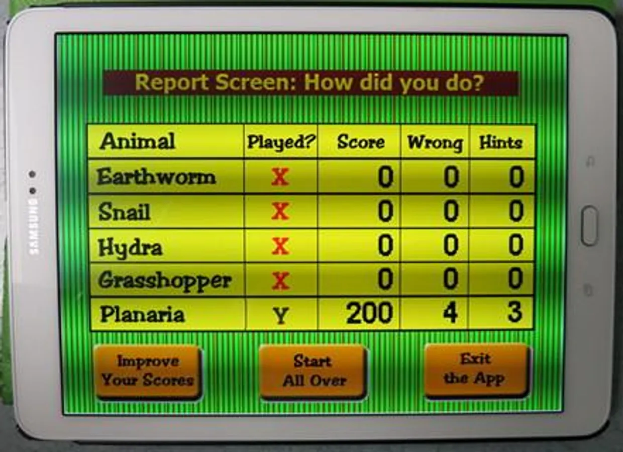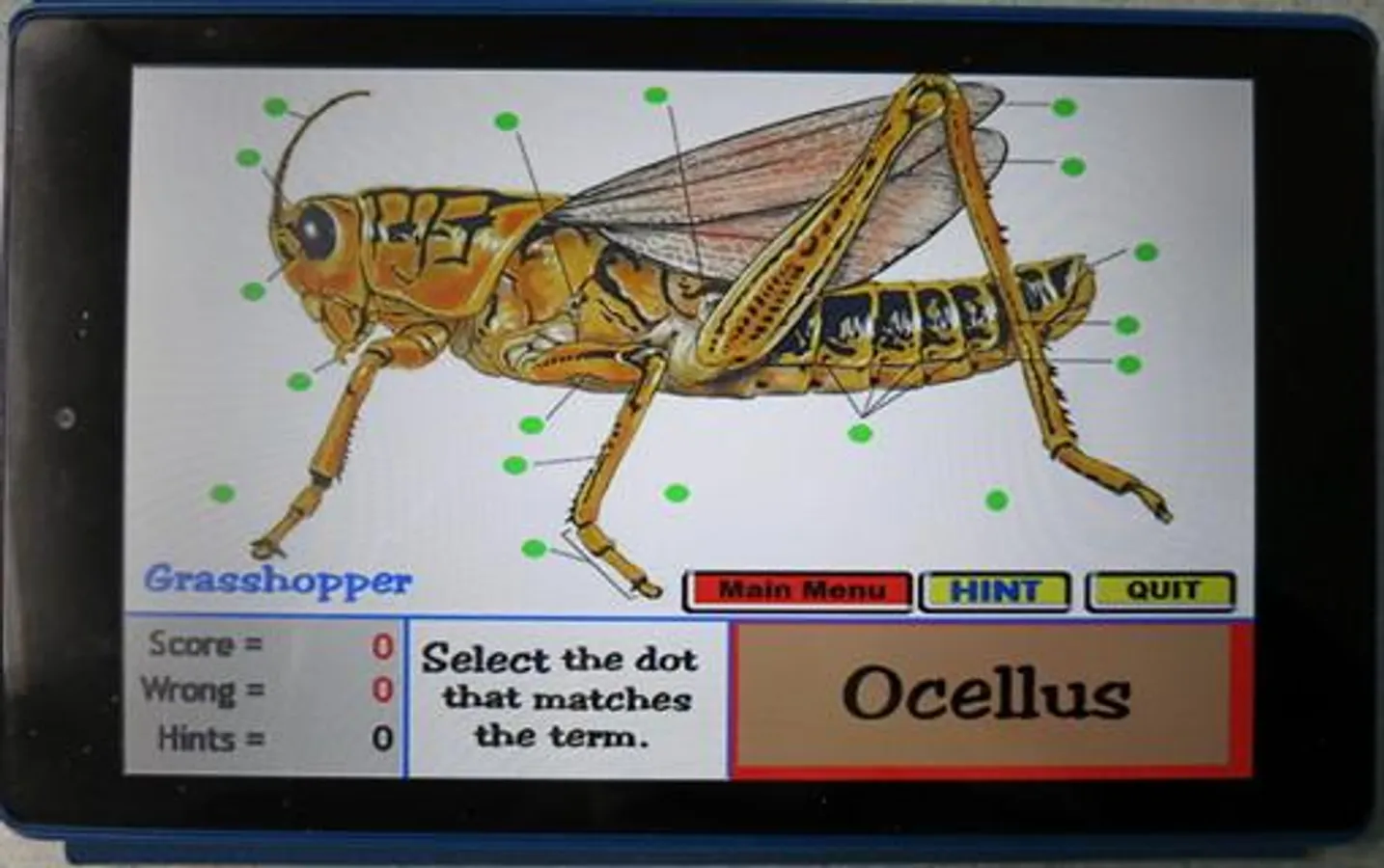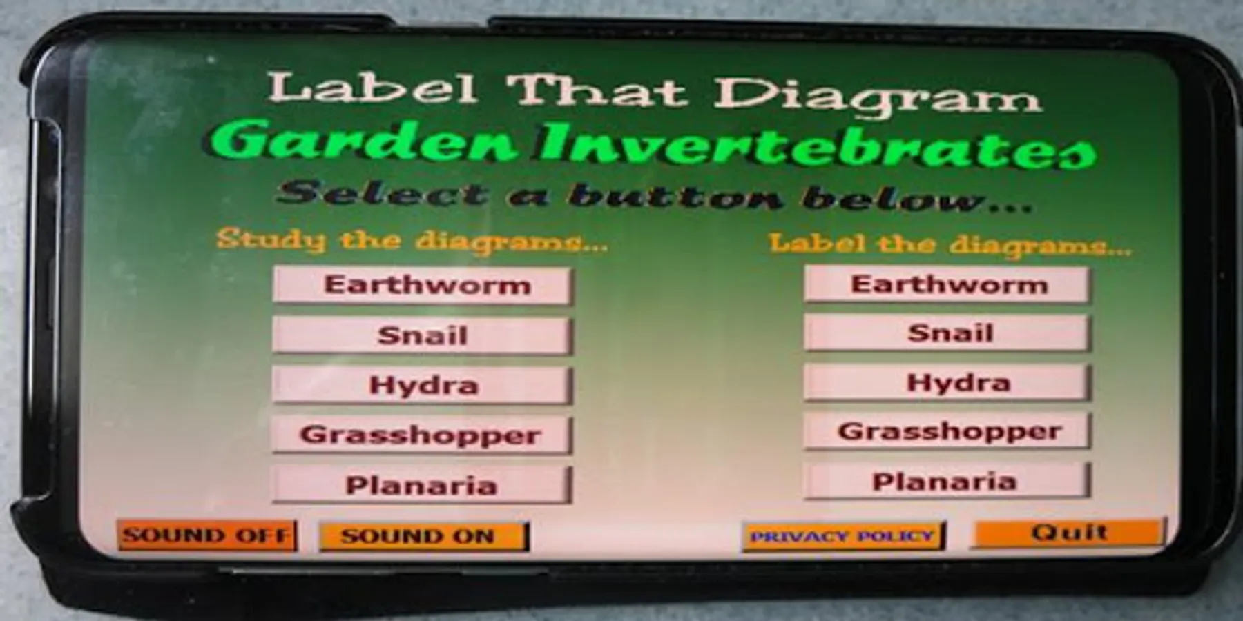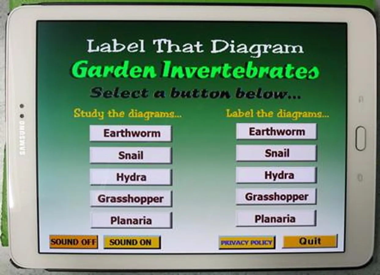 Learn the body parts of five common garden invertebrates. The app covers the earthworm, snail, grasshopper, planaria, and hydra. The app allows the student to study the labeled diagrams and then attempt to identify the labels on the diagrams. There is a report screen at the end of the app which displays the student’s score for each diagram along with the number of wrong answers and the number of hints used. The app can be used as a learning tool during the school year or as a review tool at the end of the year. Audible cues indicate when a correct or wrong answer has been chosen. After playing, the student has the choice to improve individual scores or start all over.