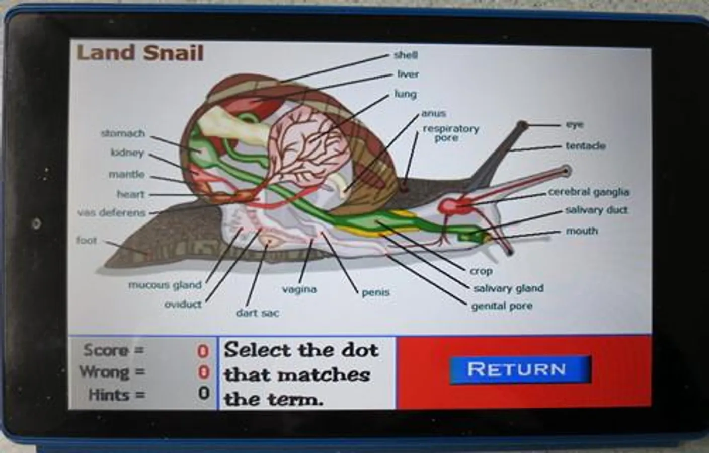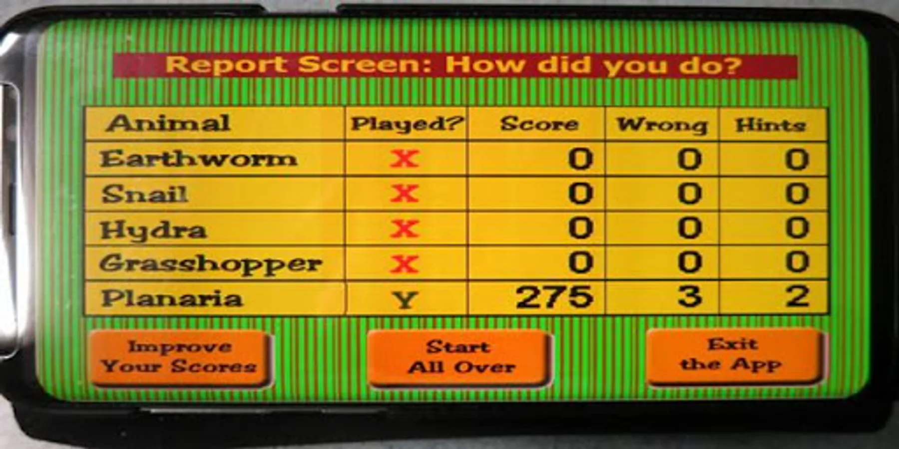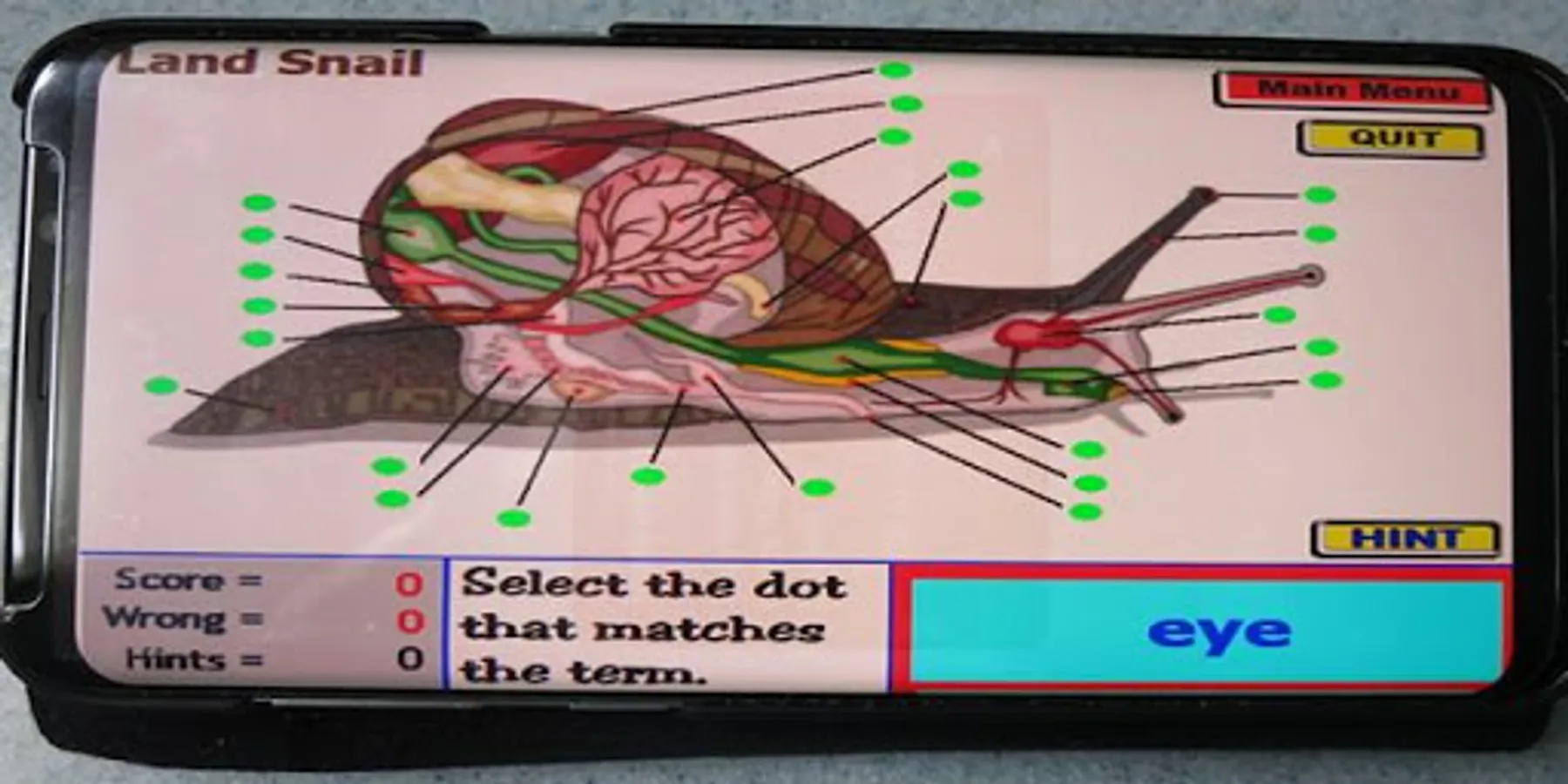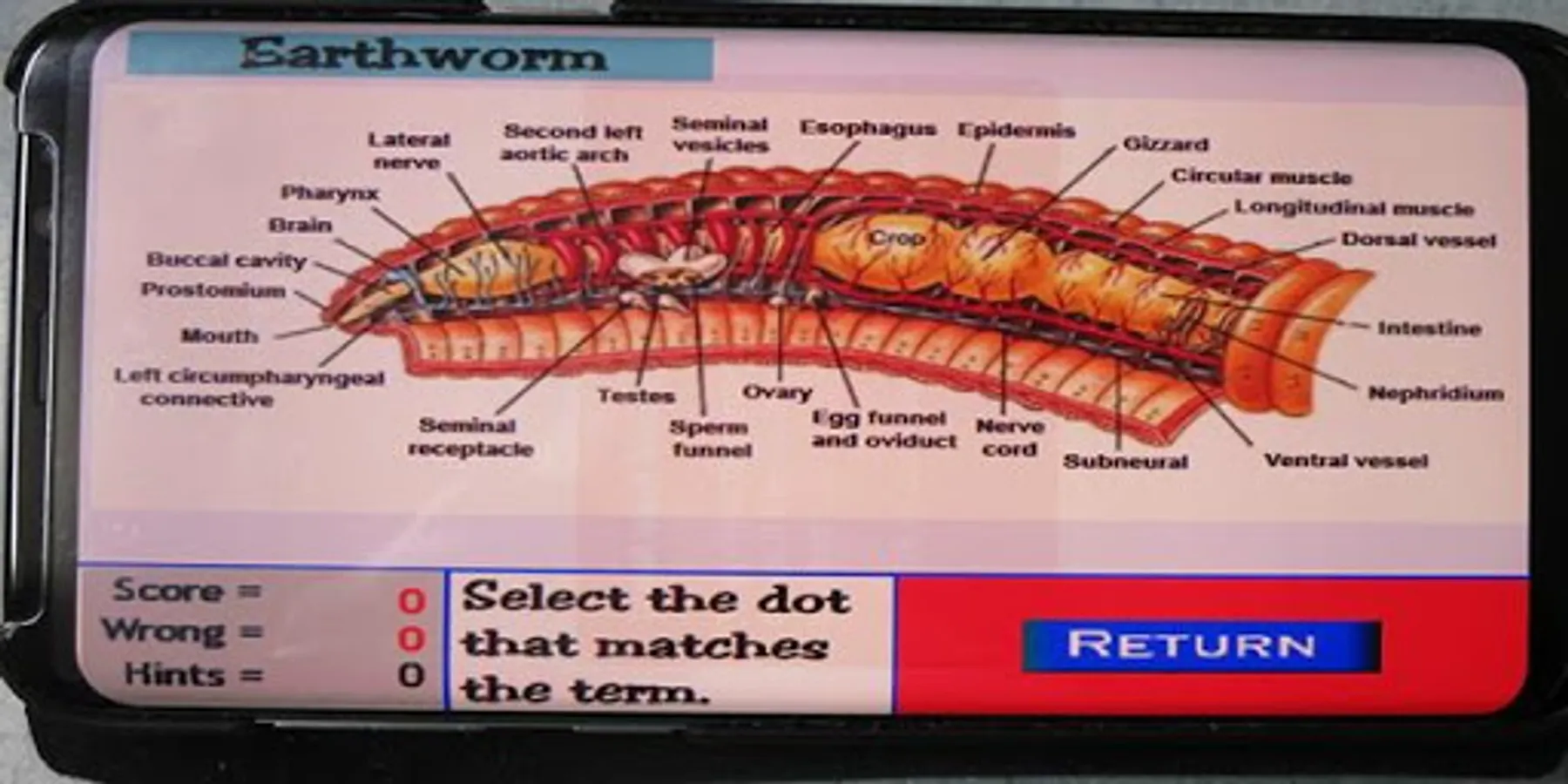Learn the body parts of five common garden invertebrates. The app covers the earthworm, snail, grasshopper, planaria, and hydra. The app allows the student to study the labeled diagrams and then attempt to identify the labels on the diagrams. There is a report screen at the end of the app which displays the student’s score for each diagram along with the number of wrong answers and the number of hints used. The app can be used as a learning tool during the school year or as a review tool at the end of the year. Audible cues indicate when a correct or wrong answer has been chosen. After playing, the student has the choice to improve individual scores or start all over.