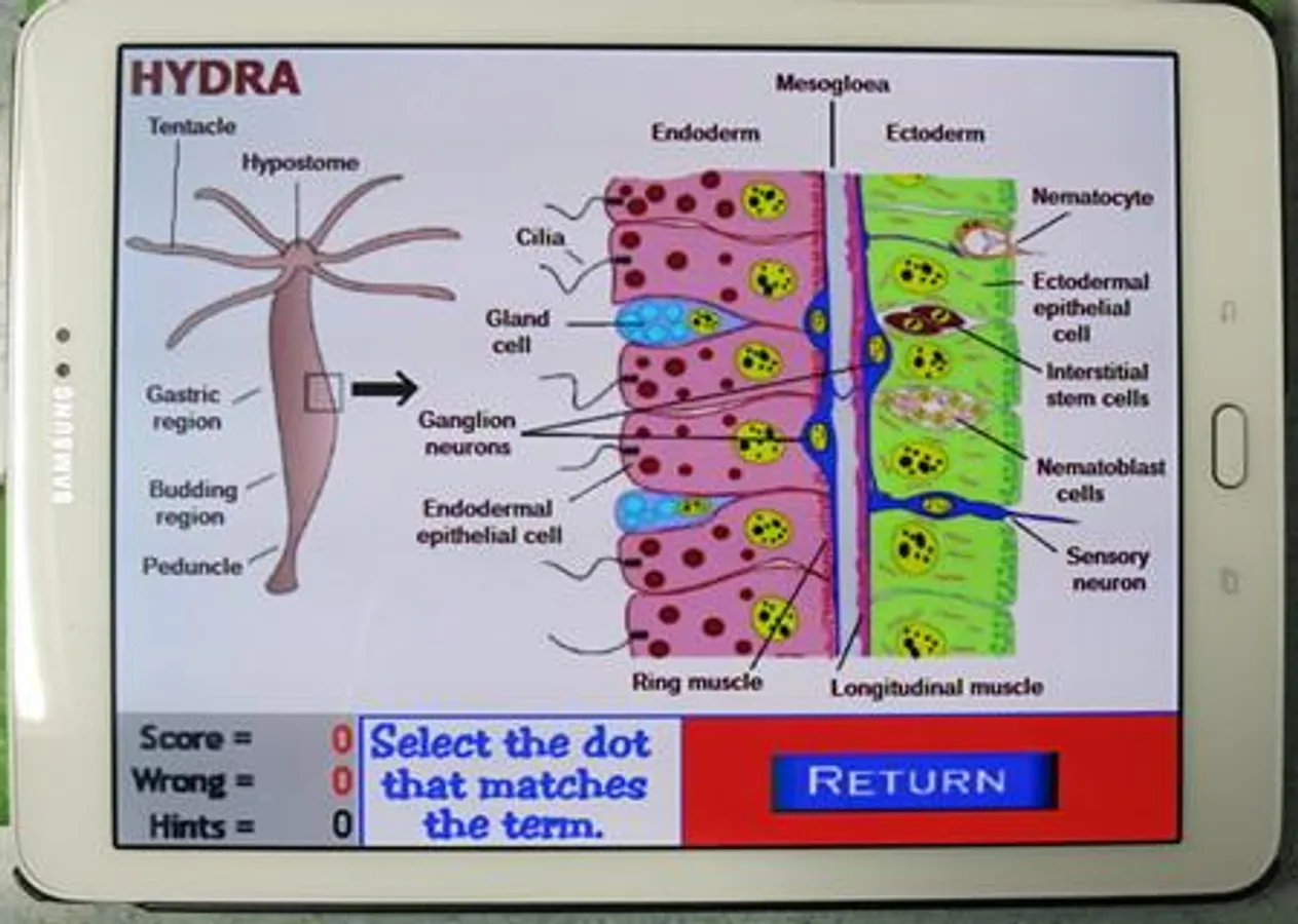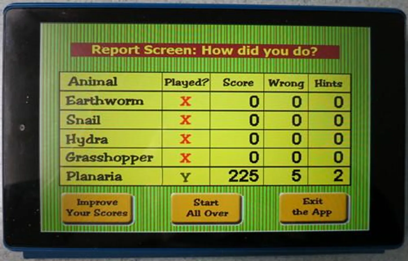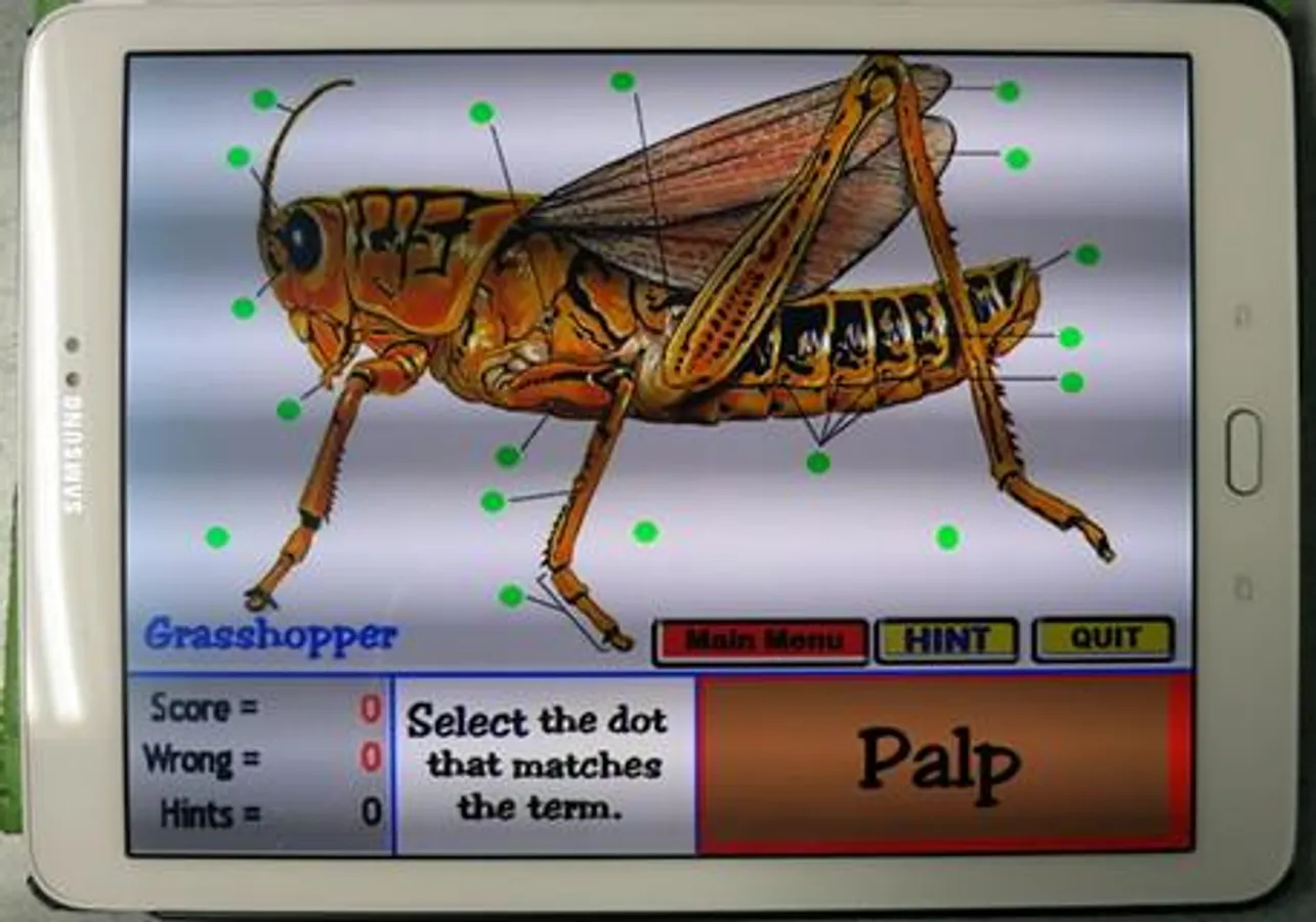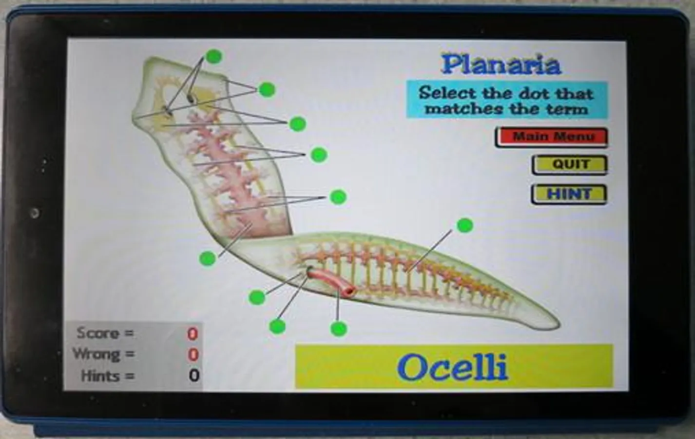 Learn the body parts of five common garden invertebrates. The app covers the earthworm, snail, grasshopper, planaria, and hydra. The app allows the student to study the labeled diagrams and then attempt to identify the labels on the diagrams. There is a report screen at the end of the app which displays the student’s score for each diagram along with the number of wrong answers and the number of hints used. The app can be used as a learning tool during the school year or as a review tool at the end of the year. Audible cues indicate when a correct or wrong answer has been chosen. After playing, the student has the choice to improve individual scores or start all over.